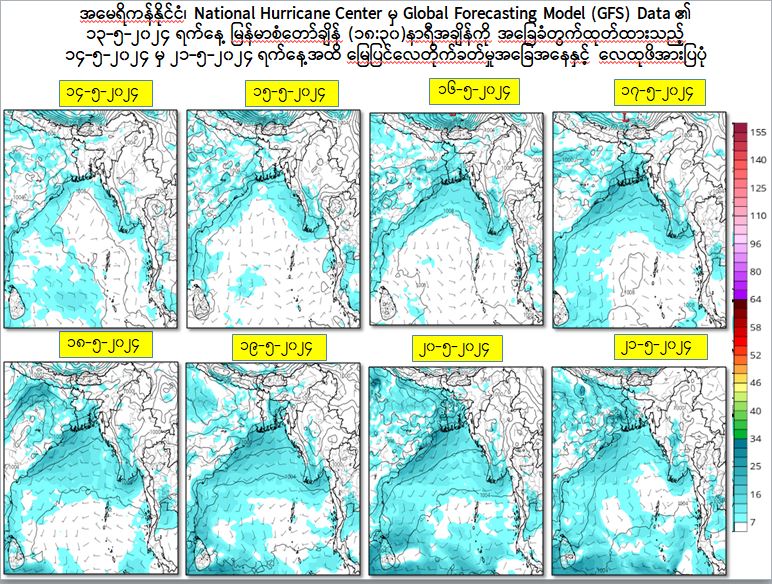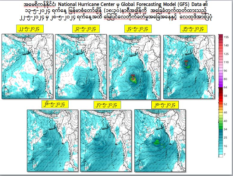 အမေရိကန်နိုင်ငံ၊ National Hurricane Center မှ Global Forecasting Model (GFS) Data ၏ ၁၃-၅-၂၀၂၄ ရက်နေ့ မြန်မာစံတော်ချိန် (၁၈:၃၀) နာရီအချိန်ကို အခြေခံတွက်ထုတ်ထားသည့် ခန့်မှန်းချက်များအရ ၂၃-၅-၂၀၂၄ ရက်နေ့ခန့်တွင် ဘင်္ဂလားပင်လယ်အော်အရှေ့အလယ်ပိုင်းတွင် လေဖိအားနည်းရပ်ဝန်း စတင်ဖြစ်ပေါ်လာနိုင်ပြီး၊ ၂၄-၅-၂၀၂၄ ရက်နေ့ခန့်တွင် ပိုမိုအားကောင်းလာနိုင်ကာ၊ ၂၅-၅-၂၀၂၄ ရက်နေ့ခန့်တွင် မြောက်- အနောက်မြောက်ဘက်သို့ ရွေ့လျားနိုင်ပြီး၊ ၂၆-၅-၂၀၂၄ ရက်နေ့ခန့်တွင် အိန္ဒိယနိုင်ငံ ကမ်းရိုးတန်းသို့ ဦးတည်ရွေ့လျားနိုင်သည်ကို တွေ့ရှိရပါသည်။