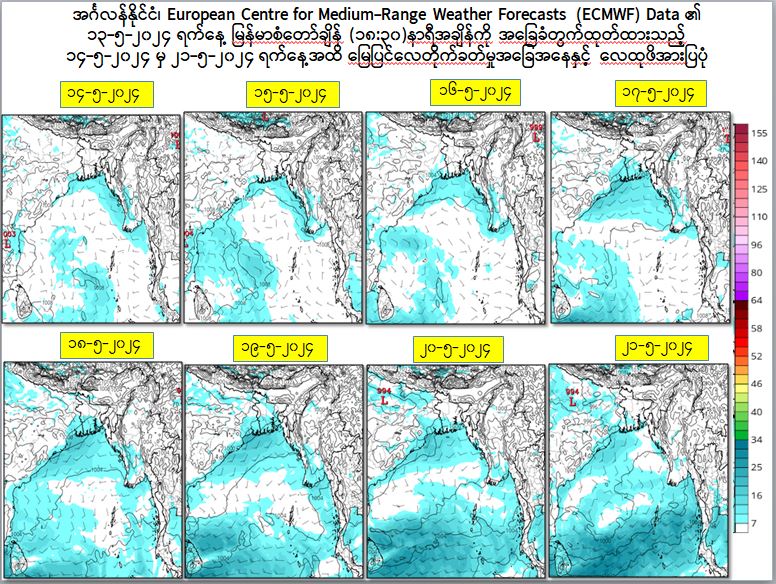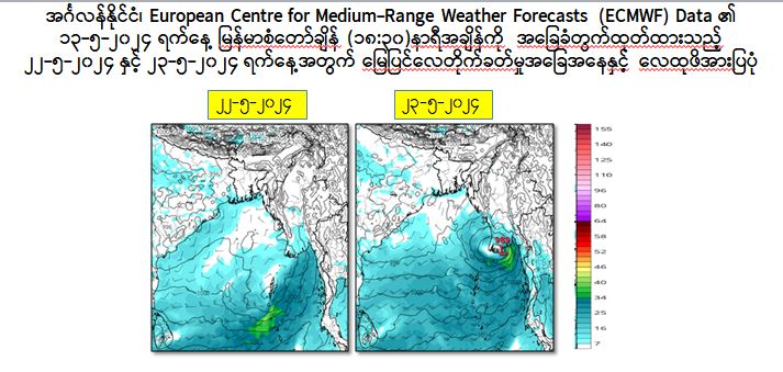 အင်္ဂလန်နိုင်ငံ၊ European Centre for Medium-Range Weather Forecasts (ECMWF) Data ၏ ၁၃-၅-၂၀၂၄ ရက်နေ့ မြန်မာစံတော်ချိန် (၁၈:၃၀) နာရီအချိန်ကို အခြေခံတွက်ထုတ်ထားသည့် ခန့်မှန်းချက်များအရ ၂၂-၅-၂၀၂၄ ရက်နေ့ခန့်တွင် ကပ္ပလီပင်လယ်ပြင်မြောက်ပိုင်းနှင့် ယင်းနှင့်ဆက်စပ်လျက်ရှိသော ဘင်္ဂလားပင်လယ်အော်အရှေ့အလယ်ပိုင်းတို့တွင် လေဖိအားနည်းရပ်ဝန်း စတင်ဖြစ်ပေါ်လာနိုင်ပြီး၊ ၂၃-၅-၂၀၂၄ ရက်နေ့ခန့်တွင် မြန်မာနိုင်ငံ မြစ်ဝကျွန်းပေါ်ဒေသသို့ ဦးတည်ရွေ့လျားနိုင်သည်ကို တွေ့ရှိရပါ သည်။