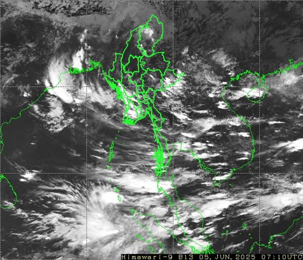 မိုးတိမ်တောင်ဖြစ်ပေါ်မှုအခြေအနေ။ ရန်ကုန်တိုင်းဒေသကြီး၊ ပဲခူးတိုင်းဒေသကြီး၊ စစ်ကိုင်းတိုင်းဒေသကြီးအထက်ပိုင်း၊ ဧရာဝတီတိုင်းဒေသကြီး၊ တနင်္သာရီတိုင်းဒေသကြီး၊ ကချင်ပြည်နယ်၊ ရခိုင်ပြည်နယ်နှင့် ရှမ်းပြည်နယ်(အရှေ့ပိုင်း)တို့တွင် မိုးတိမ်တောင်များ ဖြစ်ထွန်းလျက်ရှိပြီး၊ အဆိုပါ မိုးတိမ်တောင်များ ရွေ့လျားရာနေရာတစ်လျှောက်တွင် မိုးရွာသွန်းခြင်းနှင့်အတူ လေပြင်းတိုက်ခတ်ခြင်း၊ မိုးထစ်ချုန်းခြင်း၊ မိုးကြိုးပစ်ခြင်း၊ လျှပ်စီးလက်ခြင်းနှင့် မိုးသီးကြွေခြင်းစသည့် မိုးလေဝသဖြစ်စဉ်များ ဖြစ်ပေါ်နိုင်ပါသဖြင့် ကြိုတင်သတိပြုနိုင်ပါရန် အကြံပြုအပ်ပါသည်။