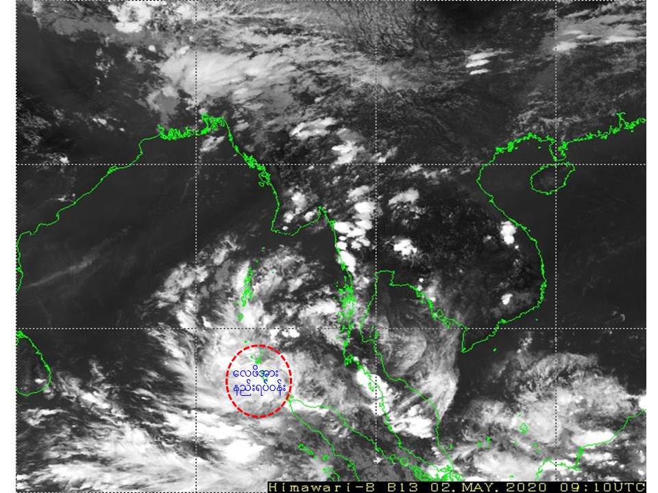 မိုးလေဝသနှင့်ဇလဗေဒညွှန်ကြားမှုဦးစီးဌာနမှ မေ ၂ ရက် ညနေ ၄ နာရီအချိန် နေ့စဉ်မိုးလေဝသသတင်းထုတ်ပြန်ရာ ဘင်္ဂလားပင်လယ်အော်အခြေအနေမှာ ယနေ့မြန်မာစံတော်ချိန် (၁၃:၃၀) နာရီအချိန်တိုင်းထွာချက်များအရ ကပ္ပလီပင်လယ်ပြင်တောင်ပိုင်းနှင့် ယင်းနှင့် ဆက်စပ်လျက်ရှိသော ဘင်္ဂလားပင်လယ်အော်အရှေ့တောင်ပိုင်းတို့တွင် ဖြစ်ပေါ်နေသော လေဖိအားနည်းရပ်ဝန်းသည် ဆက်လက်တည်ရှိနေပါသည်။