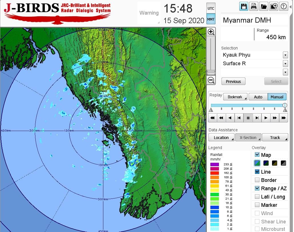မိုးလေဝသနှင့်ဇလဗေဒညွှန်ကြားမှုဦးစီးဌာနမှ စက်တင်ဘာ ၁၅ ရက် ညနေ ၄ နာရီတွင် နေ့စဉ်မိုးလေဝသသတင်း ထုတ်ပြန်ရာ ဘင်္ဂလားပင်လယ်အော်အခြေအနေမှာ ကပ္ပလီပင်လယ်ပြင်နှင့် ဘင်္ဂလားပင်လယ်အော်တောင်ပိုင်းတို့တွင် မုတ်သုံလေ အားအသင့်အတင့် ရှိနေပြီး၊ ကျန်ဘင်္ဂလားပင်လယ်အော်တွင် မုတ်သုံလေ အားနည်းနေပါသည်။