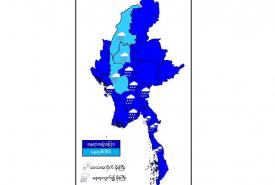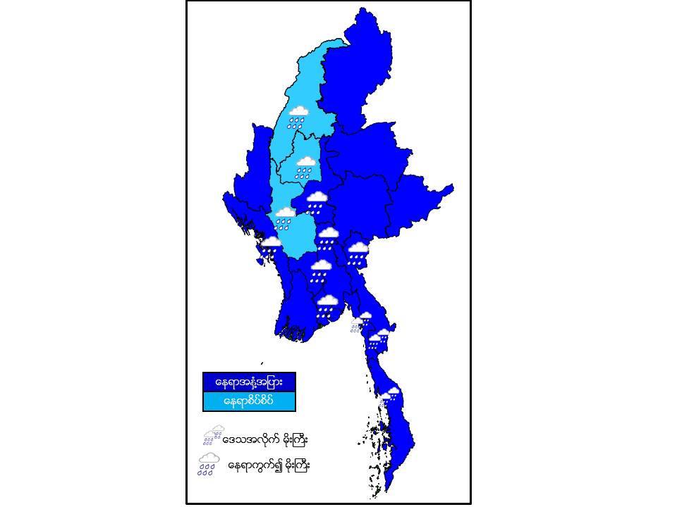 မနက်ဖြန်နံနက်အထိခန့်မှန်းချက်မှာ စစ်ကိုင်းတိုင်းဒေသကြီးနှင့် မကွေးတိုင်းဒေသကြီးတို့တွင် နေရာစိပ်စိပ်နှင့် ကျန်တိုင်းဒေသကြီးနှင့် ပြည်နယ် တို့တွင် နေရာအနှံ့အပြား မိုးထစ်ချုန်းရွာပြီး၊ တနင်္သာရီတိုင်းဒေသကြီး၊ ကရင်ပြည်နယ်နှင့် မွန်ပြည်နယ်တို့တွင် ဒေသအလိုက်နှင့် နေပြည်တော်၊ စစ်ကိုင်းတိုင်းဒေသကြီး၊ မန္တလေးတိုင်းဒေသကြီး၊ မကွေးတိုင်းဒေသကြီး၊ ပဲခူးတိုင်းဒေသကြီး၊ ရန်ကုန်တိုင်းဒေသကြီး၊ ရခိုင်ပြည်နယ်နှင့် ကယားပြည်နယ်တို့တွင် နေရာကွက်၍ မိုးကြီးနိုင်ပါသည်။ ရွာရန်ရာနှုန်းပြည့် ဖြစ်ပါသည်။