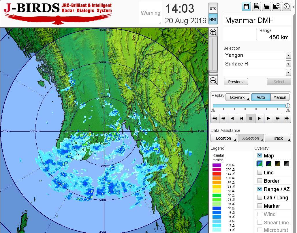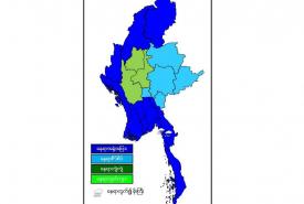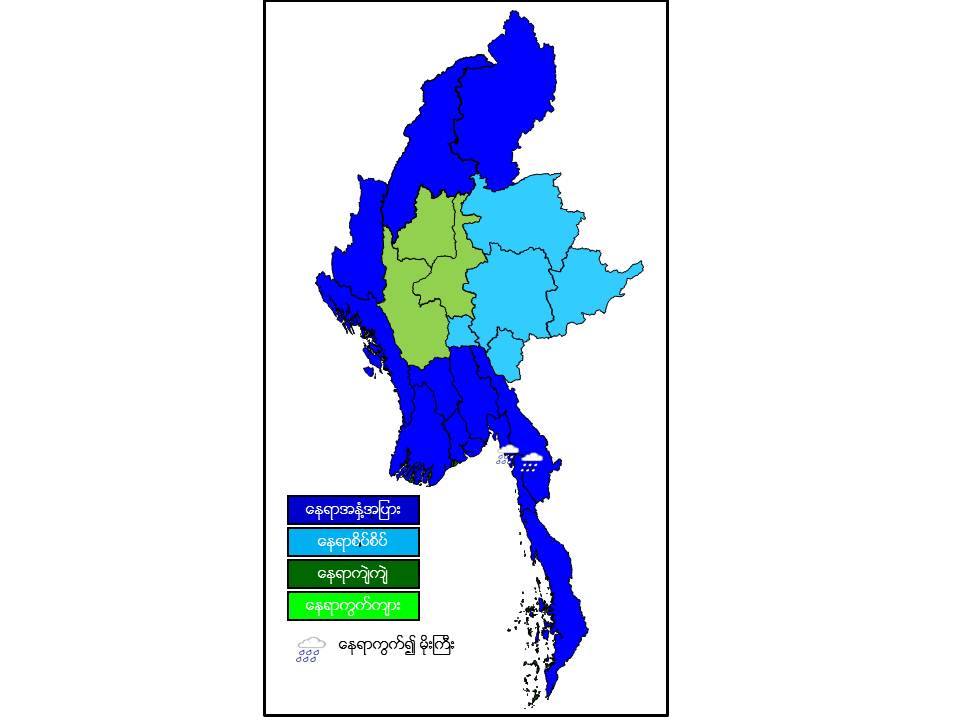 လွန်ခဲ့သည့် (၂၄) နာရီအတွင်းက စစ်ကိုင်းတိုင်းဒေသကြီးတွင် တိမ်အသင့်အတင့် ဖြစ်ထွန်းခဲ့ပြီး၊ မန္တလေးတိုင်းဒေသကြီး၊ မကွေးတိုင်းဒေသကြီး၊ ရှမ်းပြည်နယ် (အရှေ့ပိုင်း) နှင့် ကယားပြည်နယ်တို့တွင် နေရာကွက်ကျား၊ နေပြည်တော်၊ ရှမ်းပြည်နယ် (မြောက်ပိုင်းနှင့် တောင်ပိုင်း) နှင့် ချင်းပြည်နယ်တို့တွင် နေရာကျဲကျဲ၊ ရခိုင်ပြည်နယ်တွင် နေရာစိပ်စိပ်နှင့် ကျန်တိုင်းဒေသကြီးနှင့် ပြည်နယ်တို့တွင် နေရာအနှံ့အပြား မိုးထစ်ချုန်းရွာခဲ့ကာ၊ ရခိုင်ပြည်နယ်တွင် နေရာကွက်၍ မိုးကြီးခဲ့သည်။ မှတ်သားဖွယ်ရာ မိုးရေချိန်များမှာ စစ်တွေမြို့တွင် (၃ ဒသမ ၈၆) လက်မ၊ ကျိုက္ခမီမြို့တွင် (၂ ဒသမ ၆၀) လက်မ၊ ဘားအံမြို့နှင့် မုဒုံ မြို့တို့တွင် (၂ ဒသမ ၄၀) လက်မစီ၊ မိုးကောင်းမြို့တွင် (၂ ဒသမ ၃၆) လက်မ၊ မှော်ဘီ (စိုက်ပျိုးရေးမိုးလေဝသ)တွင် (၂ ဒသမ ဝ၅)လက်မ၊ ပူတာအိုမြို့တွင် (၁ ဒသမ ၉၃)လက်မ၊ သံတွဲမြို့နှင့် ပဲခူးမြို့တို့တွင် (၁ ဒသမ ၈၅) လက်မစီ၊ ကြာအင်းဆိပ်ကြီးမြို့တွင် (၁ ဒသမ ၇၈) လက်မနှင့် ခရမ်းမြို့တွင် (၁ ဒသမ ၆၇)လက်မ တို့ ဖြစ်ကြသည်။