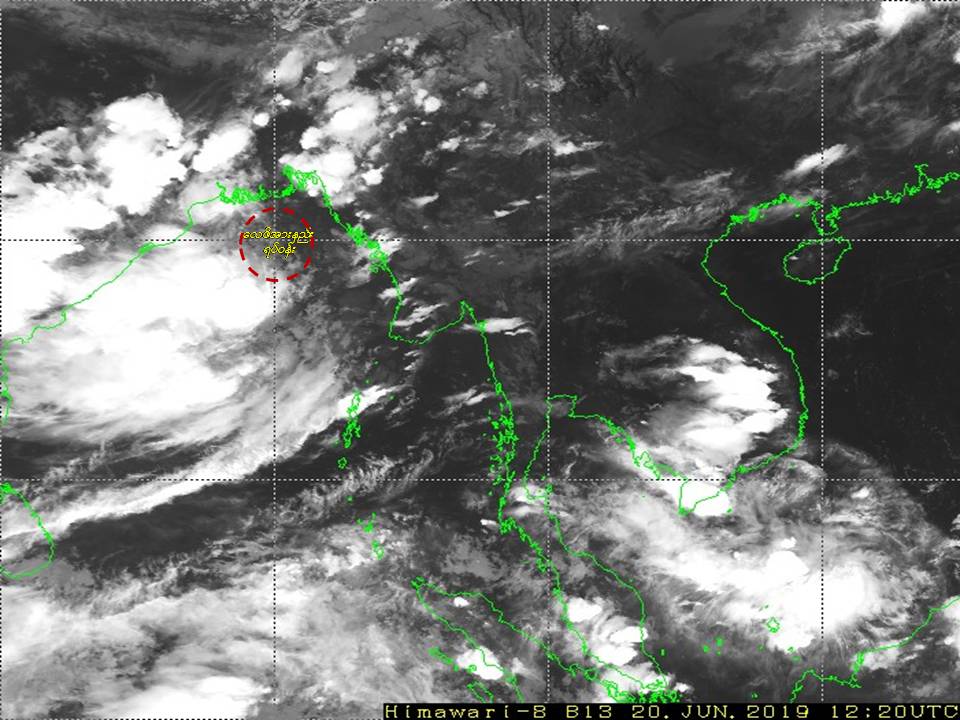 ၂၀၁၉ ခုနှစ်၊ ဇွန်လ (၂၀)ရက်နေ့ ည(၇:ဝ၀)နာရီအချိန် မိုးဇလမှ ထုတ်ပြန်ချက်အရ ယနေ့မြန်မာစံတော်ချိန် (၁၈:၃၀)နာရီအချိန် တိုင်းထွာချက်များအရ ဘင်္ဂလားပင်လယ်အော်အရှေ့မြောက်ပိုင်းတွင် ဖြစ်ပေါ်နေသော လေဖိအားနည်းရပ်ဝန်းသည် ဆက်လက် တည်ရှိနေပါသည်။ ကပ္ပလီပင်လယ်ပြင်နှင့် ဘင်္ဂလားပင်လယ်အော်တို့တွင် မုတ်သုန်လေ အားကောင်းနေပါသည်။