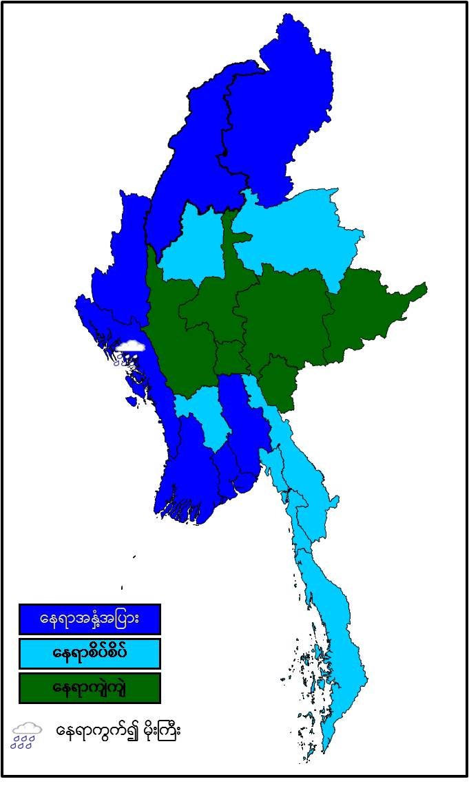မနက်ဖြန်နံနက်အထိခန့်မှန်းချက်။ နေပြည်တော်၊ မန္တလေးတိုင်းဒေသကြီး၊မကွေးတိုင်းဒေသကြီး၊ ရှမ်းပြည်နယ်(တောင်ပိုင်းနှင့် အရှေ့ပိုင်း)နှင့် ကယားပြည်နယ်တို့တွင် နေရာကျဲကျဲ၊ စစ်ကိုင်းတိုင်းဒေသကြီးအောက်ပိုင်း၊ ပဲခူးတိုင်းဒေသကြီး၊ တနင်္သာရီတိုင်းဒေသကြီး၊ ရှမ်းပြည်နယ်(မြောက်ပိုင်း)၊ ကရင်ပြည်နယ်နှင့် မွန်ပြည်နယ်တို့တွင် နေရာစိပ်စိပ်နှင့် ကျန်တိုင်းဒေသကြီးနှင့် ပြည်နယ်တို့တွင် နေရာအနှံ့အပြား မိုးထစ်ချုန်းရွာပြီး၊ ရခိုင်ပြည်နယ်တွင် နေရာကွက်၍ မိုးကြီးနိုင်ပါသည်။ ရွာရန်ရာနှုန်းပြည့် ဖြစ်ပါသည်။