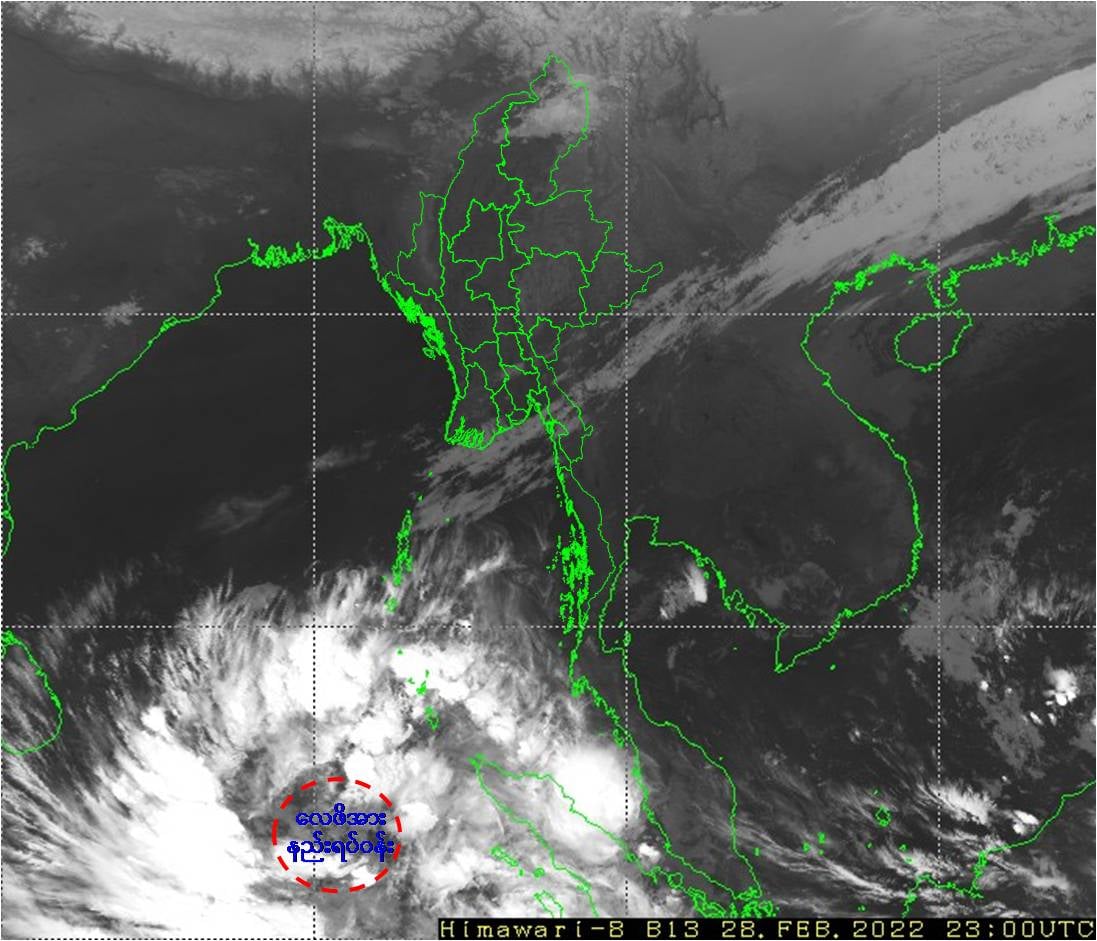 မိုးလေဝသနှင့် ဇလဗေဒညွှန်ကြားမှု ဦးစီးဌာနက ယနေ့မြန်မာစံတော်ချိန် (၀၅:၃၀) နာရီ တိုင်းထွာချက်များအရ ဘင်္ဂလားပင်လယ် အော်အရှေ့တောင်ပိုင်းနှင့် ယင်းနှင့်ဆက်စပ်လျက်ရှိသော ကပ္ပလီပင်လယ်ပြင်တောင်ပိုင်း နှင့် အီကွေတာအနီး အိန္ဒိယသမုဒ္ဒရာတို့တွင် ဖြစ်ပေါ်နေသော လေဖိအားနည်းရပ်ဝန်းသည် ဆက်လက်တည်ရှိနေကြောင်း သိရသည်။ အဆိုပါ လေဖိအားနည်းရပ်ဝန်းသည် အနောက်-အနောက် မြောက်ဘက်သို့ ဆက်လက်ရွေ့လျားမည်ဟု ခန့်မှန်းရသည်။ ကပ္ပလီပင်လယ်ပြင်တောင်ပိုင်းနှင့် ဘင်္ဂလားပင်လယ်အော်တောင်ပိုင်းတို့တွင် တိမ်ထူထပ်နေပြီး၊ ကပ္ပလီပင်လယ်ပြင်မြောက်ပိုင်းနှင့် ဘင်္ဂလားပင်လယ်အော်အရှေ့အလယ်ပိုင်းတို့တွင် တိမ်အနည်းငယ်မှ တိမ်အသင့်အတင့် ဖြစ်ထွန်းနေကာ ကျန်ဘင်္ဂလားပင်လယ်အော်တွင် အများအားဖြင့် သာယာနေသည်။