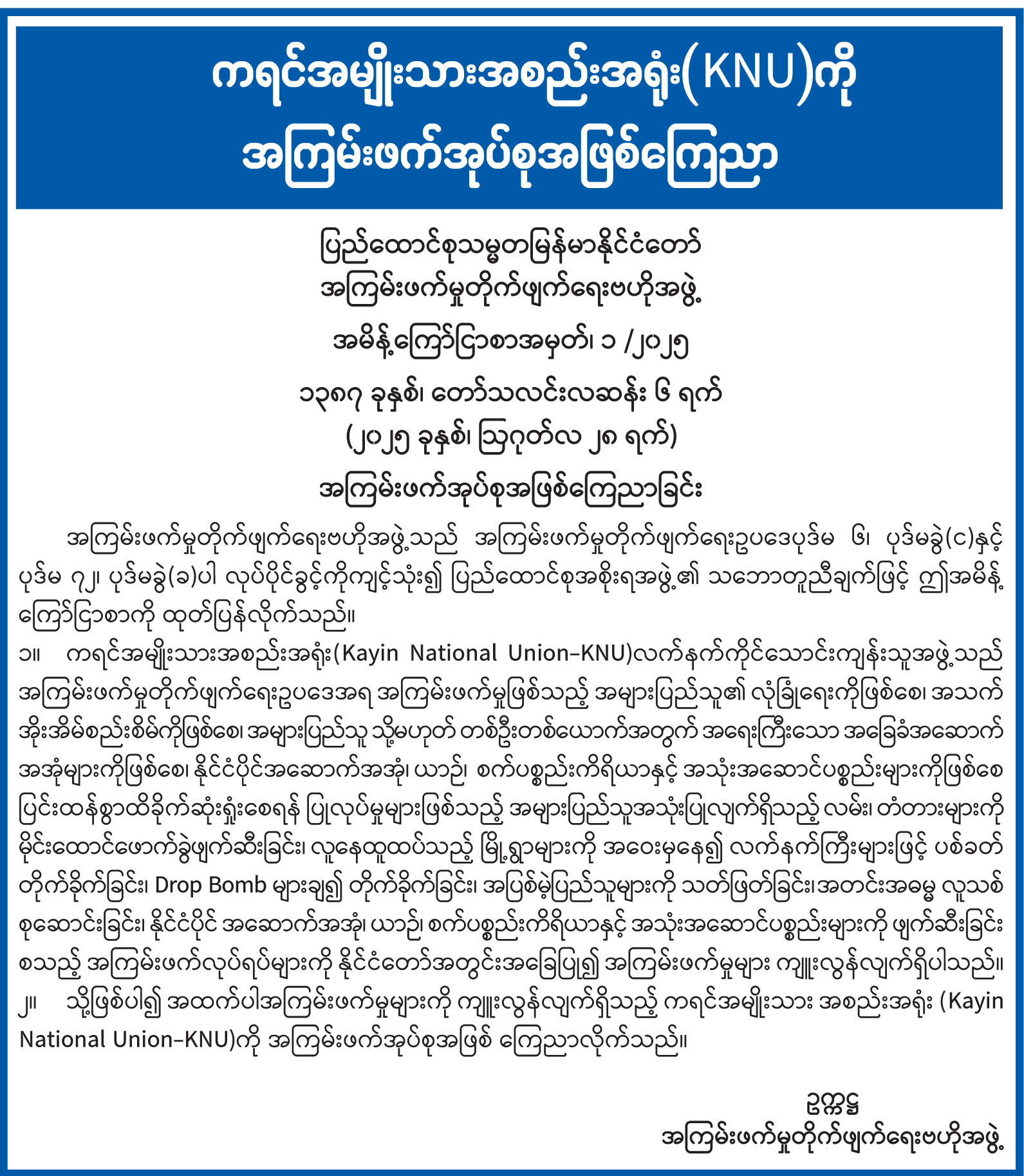 ကရင်အမျိုးသားအစည်းအရုံး(KNU)ကို အကြမ်းဖက်အုပ်စုအဖြစ်ကြေညာ