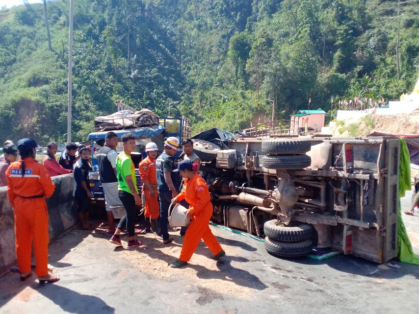ကရင်ပြည်နယ်၊ မြဝတီ-အာရှလမ်းမကြီး၊ မိုင်တိုင်အမှတ် (၁၄၆-၁၄၇) ကြား ကုန်းအဆင်းတွင် ယနေ့ မွန်းလွဲ ၁၂ နာရီ ခန့်က မြဝတီဘက် မှ ကော့ကရိတ်ဘက်သို့ သဲများတင်ဆောင်၍မောင်းနှင်လာသော သဲကားနှင့် ကော့ကရိတ်ဘက်မှ မြဝတီဘက်သို့ ပွဲဈေးပစ္စည်းများတင်ဆောင်၍ မောင်းနှင်လာသော ထော်လာဂျီတို့ တိုက်မိကြောင်း မြန်မာနိုင်ငံမီးသတ်တပ်ဖွဲ့မှ သိရသည်။
