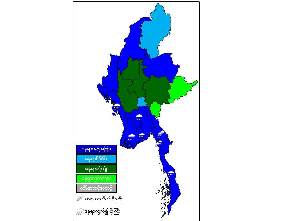 နောက်(၂)ရက်အတွက်ခန့်မှန်းချက်မှာ ကရင်ပြည်နယ်နှင့် မွန်ပြည်နယ်တို့တွင် မိုးဆက်လက်ပိုနေမည်။