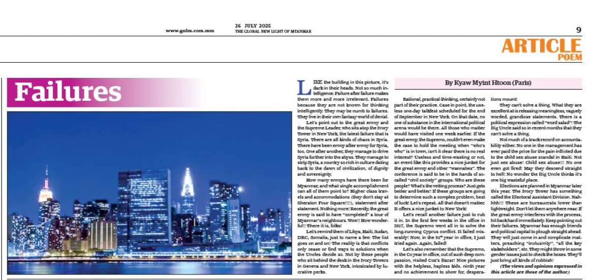 (၂၇ - ၇ -၂၀၂၅ ရက်နေ့ထုတ် The Global New Light of Myanmar သတင်းစာပါ Kyaw Myint Htoon (Paris) ၏ Failures ကို ဆီလျော်အောင် ဘာသာပြန်ဆိုထားပါသည်။)