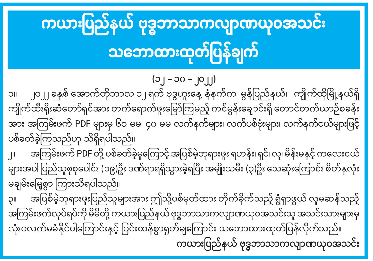 ၃။ အပြစ်မဲ့ဘုရားဖူးပြည်သူများအား ဤသို့ပစ်မှတ်ထား တိုက်ခိုက်သည့် ရွံရှာဖွယ် လူမဆန်သည့် အကြမ်းဖက်လုပ်ရပ်ကို မိမိတို့ကယားပြည်နယ် ဗုဒ္ဓဘာသာကလျာဏယုဝအသင်းသူ အသင်းသားများမှ လုံးဝလက်မခံနိုင်ပါကြောင်းနှင့် ပြင်းထန်စွာရှုတ်ချကြောင်း သဘောထားထုတ်ပြန်လိုက်သည်။