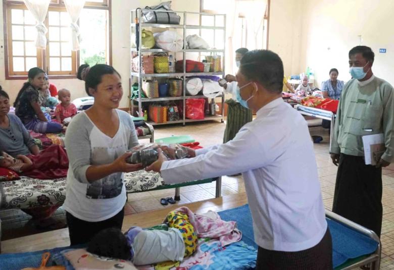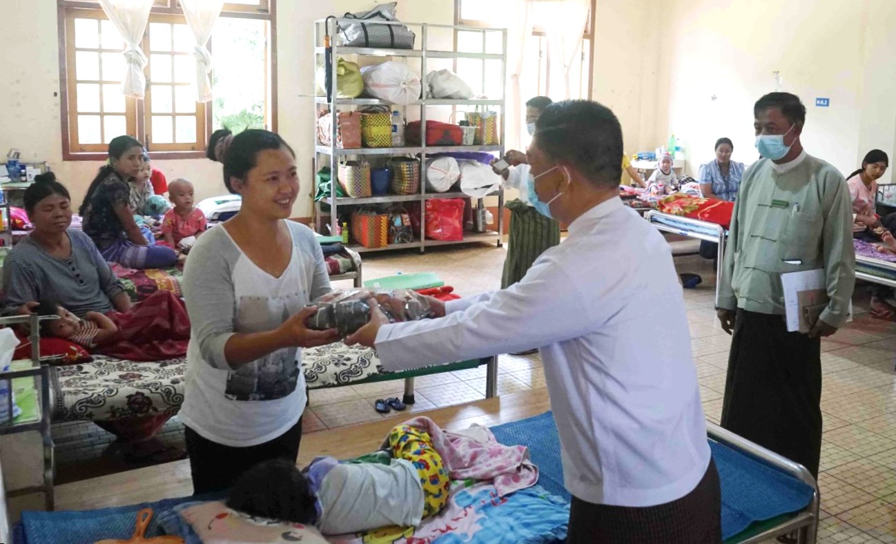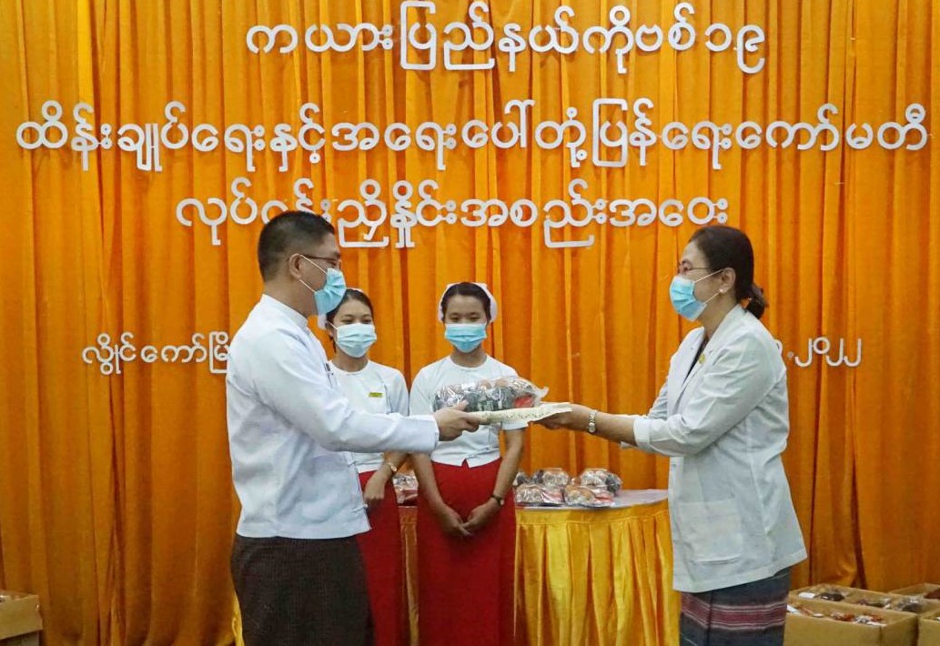 ယင်းနောက် ပြည်နယ်ဝန်ကြီးချုပ်က လွိုင်ကော်မြို့ ပြည်နယ်ပြည်သူ့ဆေးရုံကြီးရှိ ကျန်းမာရေး ဝန်ထမ်းများအား ထောက်ပံ့ပစ္စည်းများ ပေးအပ်ရာ ပြည်နယ်ပြည်သူ့ဆေးရုံအုပ်ကြီးက လက်ခံရယူသည်။ ဆက်လက်၍ ပြည်နယ်ဝန်ကြီးချုပ်နှင့် တာဝန်ရှိသူများက ဆေးရုံရှိ ဆေးကုသဆောင်၊ ကလေးလူနာဆောင်၊ ထိခိုက်ဒဏ်ရာနှင့် အရိုးရောဂါကု လူနာဆောင်နှင့် ခွဲစိတ်ကုသဆောင်များသို့ သွားရောက်၍ လူနာများအား ကြည့်ရှုအားပေးစကား ပြောကြားပြီး အာဟာရဖြည့် အစားအသောက်များ ပေးအပ်လှူဒါန်းသည်။
