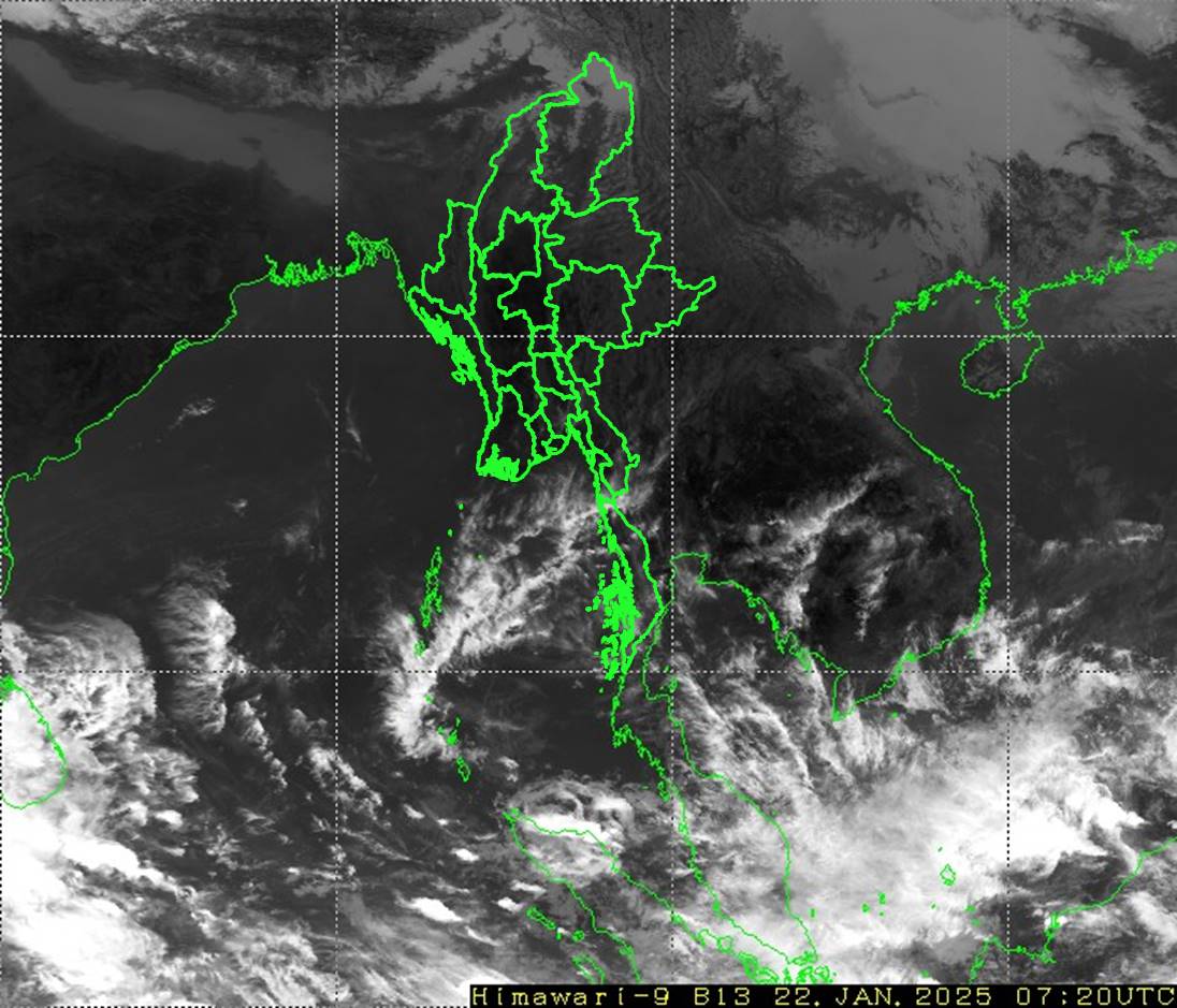 ယမန်နေ့နံနက်(၀၉:၃၀)နာရီအချိန်မှ ယနေ့နံနက်(၀၉:၃၀)နာရီအချိန်အထိ မိုးလေဝသ တိုင်းထွာချက်အကျဉ်းချုပ်။ လွန်ခဲ့သော(၂၄)နာရီအတွင်းက စစ်ကိုင်းတိုင်းဒေသကြီးအထက်ပိုင်း၊ ဧရာဝတီတိုင်းဒေသကြီး၊ တနင်္သာရီတိုင်းဒေသကြီး၊ ကချင်ပြည်နယ်၊ ကရင်ပြည်နယ်၊ မွန်ပြည်နယ်နှင့် ရှမ်းပြည်နယ်(အရှေ့ပိုင်း)တို့တွင် တိမ်အသင့်အတင့် ဖြစ်ထွန်းခဲ့ပြီး၊ ကျန်တိုင်းဒေသကြီးနှင့် ပြည်နယ်တို့တွင် အများအားဖြင့် သာယာခဲ့ပါသည်။ ညအပူချိန်များမှာ ရခိုင်ပြည်နယ်တွင် ဇန်နဝါရီလ၏ ပျမ်းမျှအပူချိန်အောက် ၃ ဒီဂရီဆဲလ်စီးယပ်နှင့် တနင်္သာရီတိုင်းဒေသကြီးနှင့် မွန်ပြည်နယ်တို့တွင် ဇန်နဝါရီလ၏ ပျမ်းမျှအပူချိန်တို့အောက် ၂ ဒီဂရီဆဲလ်စီးယပ် လျော့နည်းခဲ့ပြီး၊ မန္တလေးတိုင်းဒေသကြီး၊ မကွေးတိုင်းဒေသကြီး၊ ကချင်ပြည်နယ်၊ ကယားပြည်နယ်နှင့် ရှမ်းပြည်နယ်(မြောက်ပိုင်းနှင့် အရှေ့ပိုင်း)တို့တွင် ဇန်နဝါရီလ၏ ပျမ်းမျှအပူချိန်တို့ထက် ၂ ဒီဂရီဆဲလ်စီးယပ်နှင့် စစ်ကိုင်းတိုင်းဒေသကြီးနှင့် ချင်းပြည်နယ်တို့တွင် ဇန်နဝါရီလ၏ ပျမ်းမျှအပူချိန်တို့ထက် ၃ ဒီဂရီဆဲလ်စီးယပ်မှ ၄ ဒီဂရီဆဲလ်စီးယပ်အထိ ပိုခဲ့ကာ၊ ကျန်တိုင်းဒေသကြီးနှင့် ပြည်နယ်တို့တွင် ဇန်နဝါရီလ၏ ပျမ်းမျှအပူချိန်ခန့်သာ ရှိခဲ့ပါသည်။ ထူးခြားသည့် ညအပူချိန်များမှာ နမ့်စန်မြို့(ရှမ်းပြည်နယ်တောင်ပိုင်း)တွင် ၃.၁ ဒီဂရီဆဲလ်စီးယပ်၊ ဟဲဟိုးမြို့တွင် ၃.၈ ဒီဂရီဆဲလ်စီးယပ်၊ ပင်လောင်းမြို့တွင် ၄.၆ ဒီဂရီဆဲလ်စီးယပ်၊ လွိုင်လင်မြို့တွင် ၅.၀ ဒီဂရီဆဲလ်စီးယပ်၊ မိုင်းယန်းမြို့တွင် ၆.၀ ဒီဂရီဆဲလ်စီးယပ်၊ တီးတိန်မြို့တွင် ၇.၃ ဒီဂရီဆဲလ်စီးယပ်၊ ဟားခါးမြို့တွင် ၇.၄ ဒီဂရီဆဲလ်စီးယပ်၊ တောင်ကြီးမြို့တွင် ၈.၀ ဒီဂရီဆဲလ်စီးယပ်၊ ပြင်ဦးလွင်မြို့တွင် ၈.၄ ဒီဂရီဆဲလ်စီးယပ်နှင့် မြစ်ကြီးနားမြို့တွင် ၈.၅ ဒီဂရီဆဲလ်စီးယပ်တို့ ဖြစ်ကြပါသည်။