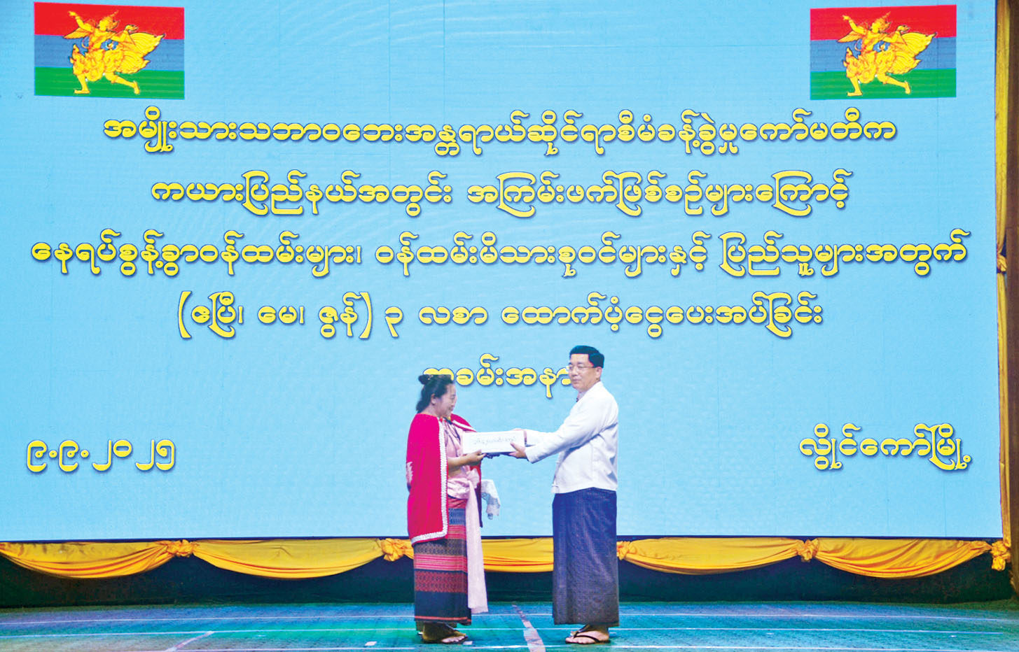 ကယားပြည်နယ်အတွင်း အကြမ်းဖက်ဖြစ်စဉ်များကြောင့် နေရပ်စွန့်ခွာခဲ့ရသည့် ဝန်ထမ်းများနှင့် ၎င်းတို့၏မိသားစုဝင်များ၊ ပြည်သူများအတွက် အမျိုးသားသဘာဝဘေးအန္တရာယ်ဆိုင်ရာ စီမံခန့်ခွဲမှုရန်ပုံငွေမှ တတိယအကြိမ် ထောက်ပံ့ငွေပေးအပ်ခြင်း အခမ်းအနားကို ယနေ့နံနက်ပိုင်းတွင် လွိုင်ကော်မြို့ ပြည်နယ်ခန်းမ၌ ကျင်းပရာ ပြည်နယ်ဝန်ကြီးချုပ် ဦးဇော်မျိုးတင်၊ ဒေသကွပ်ကဲရေးမှူး၊ ပြည်နယ်တရားသူကြီးချုပ်၊ ပြည်နယ်ဝန်ကြီးများ၊ ဌာနဆိုင်ရာ ဝန်ထမ်းများနှင့် မိသားစုဝင်များ၊ ပြည်သူများ တက်ရောက်ကြသည်။