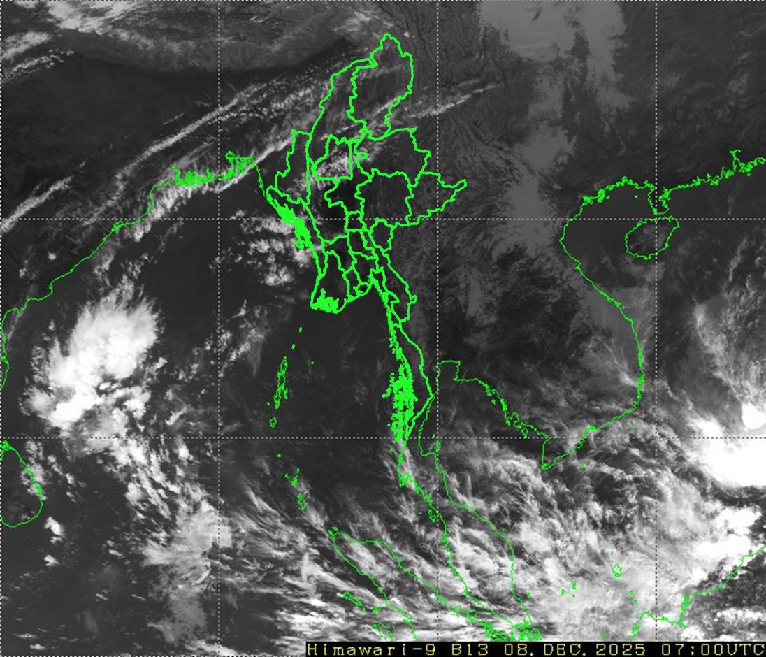ယမန်နေ့နံနက် ၀၉:၃၀ နာရီအချိန်မှ ယနေ့နံနက် ၀၉:၃၀ နာရီအချိန်အထိ မိုးလေဝသတိုင်းထွာချက်အကျဉ်းချုပ်။ လွန်ခဲ့သော ၂၄ နာရီအတွင်းက နေပြည်တော်၊ ပဲခူးတိုင်းဒေသကြီး၊ ကယားပြည်နယ်၊ ချင်းပြည်နယ်နှင့် ရှမ်းပြည်နယ်(မြောက်ပိုင်းနှင့် တောင်ပိုင်း)တို့တွင် အများအားဖြင့် သာယာခဲ့ပြီး ကျန်တိုင်းဒေသကြီးနှင့် ပြည်နယ်တို့တွင် တိမ်အသင့်အတင့် ဖြစ်ထွန်းခဲ့ပါသည်။ ညအပူချိန်များမှာ ချင်းပြည်နယ်တွင် ဒီဇင်ဘာလ၏ ပျမ်းမျှ အပူချိန်အောက် ၄ ဒီဂရီဆဲလ်စီးယပ်၊ စစ်ကိုင်းတိုင်းဒေသကြီးအထက်ပိုင်း၊ ကချင်ပြည်နယ်နှင့် ကယားပြည်နယ်တို့တွင် ဒီဇင်ဘာလ၏ ပျမ်းမျှအပူချိန်တို့အောက် ၂ ဒီဂရီဆဲလ်စီးယပ်လျော့နည်းခဲ့ပြီး ဧရာဝတီတိုင်းဒေသကြီး၊ ကရင်ပြည်နယ်နှင့် မွန်ပြည်နယ်တို့တွင် ဒီဇင်ဘာလ၏ ပျမ်းမျှအပူချိန်တို့ထက် ၂ ဒီဂရီဆဲလ်စီးယပ်ပိုခဲ့ကာ ကျန်တိုင်းဒေသကြီးနှင့် ပြည်နယ်တို့တွင် ဒီဇင်ဘာလ၏ ပျမ်းမျှအပူချိန်ခန့်သာ ရှိခဲ့ပါသည်။ ထူးခြားသည့် ညအပူချိန်များမှာ ဟားခါးမြို့တွင် ၁.၂ ဒီဂရီဆဲလ်စီးယပ်၊ တီးတိန်မြို့တွင် ၄.၅ ဒီဂရီဆဲလ်စီးယပ်၊ ဟဲဟိုးမြို့တွင် ၅.၄ ဒီဂရီဆဲလ်စီးယပ်၊ ပူတာအိုမြို့တွင် ၅.၅ ဒီဂရီ ဆဲလ်စီးယပ်၊ လွိုင်လင်မြို့တွင် ၅.၈ ဒီဂရီဆဲလ်စီးယပ်၊ နမ့်စန်မြို့(ရှမ်းပြည်နယ်တောင်ပိုင်း)တွင် ၇.၁ ဒီဂရီဆဲလ်စီးယပ်၊ ပင်လောင်းမြို့တွင် ၇.၅ ဒီဂရီဆဲလ်စီးယပ်၊ မိုင်းယန်းမြို့တွင် ၈.၀ ဒီဂရီဆဲလ်စီးယပ်၊ မချမ်းဘောမြို့တွင် ၈.၃ ဒီဂရီဆဲလ်စီးယပ်နှင့် လားရှိုးမြို့တွင် ၈.၆ ဒီဂရီဆဲလ်စီးယပ်တို့ ဖြစ်ကြပါသည်။