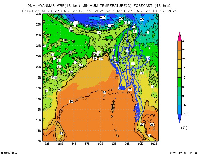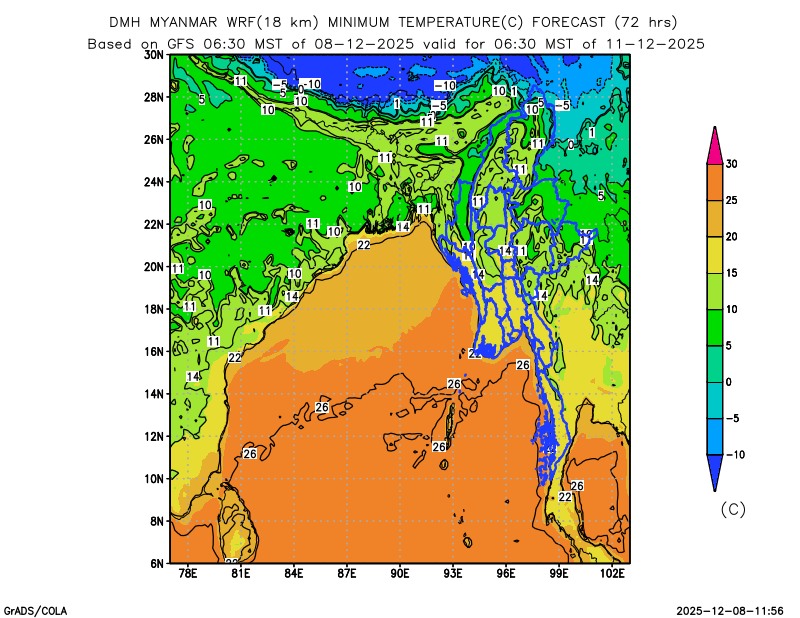 နောက် ၂ ရက်အတွက်ခန့်မှန်းချက်။ ကယားပြည်နယ်နှင့် ရှမ်းပြည်နယ်(တောင်ပိုင်းနှင့် အရှေ့ပိုင်း)တို့တွင် ညအပူချိန်များ အနည်းငယ် လျော့နည်းနိုင်ပါသည်။