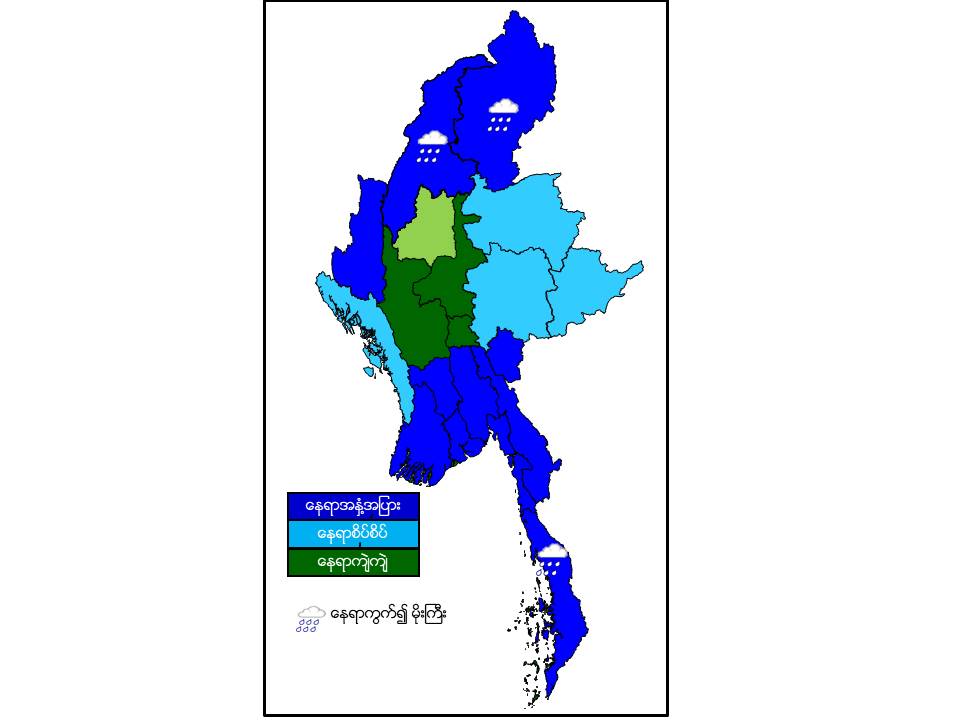 နောက်(၂)ရက်အတွက်ခန့်မှန်းချက်။ ဧရာဝတီတိုင်းဒေသကြီး၊ ရခိုင်ပြည်နယ်၊ ကရင်ပြည်နယ်နှင့် မွန်ပြည်နယ်တို့တွင် မိုးပိုလာနိုင်ပါသည်။