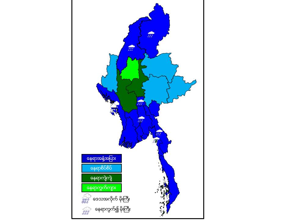 မနက်ဖြန်နံနက်အထိခန့်မှန်းချက်။ စစ်ကိုင်းတိုင်းဒေသကြီးအောက်ပိုင်းတွင် နေရာကွက်ကျား၊ မန္တလေးတိုင်းဒေသကြီးနှင့် မကွေးတိုင်းဒေသကြီး တို့တွင် နေရာကျဲကျဲ၊ ရှမ်းပြည်နယ်နှင့် ချင်းပြည်နယ်တို့တွင် နေရာစိပ်စိပ်နှင့် ကျန်တိုင်းဒေသကြီးနှင့် ပြည်နယ်တို့တွင် နေရာအနှံ့အပြား မိုးထစ်ချုန်းရွာပြီး၊ ရခိုင်ပြည်နယ်တွင် ဒေသအလိုက်နှင့် နေပြည်တော်၊ စစ်ကိုင်းတိုင်းဒေသကြီးအထက်ပိုင်း၊ ပဲခူးတိုင်းဒေသကြီး၊ ကချင်ပြည်နယ်၊ ကရင်ပြည်နယ်နှင့် မွန်ပြည်နယ်တို့တွင် နေရာကွက်၍ မိုးကြီးနိုင်ပါသည်။ ရွာရန်ရာနှုန်းပြည့် ဖြစ်ပါသည်။
