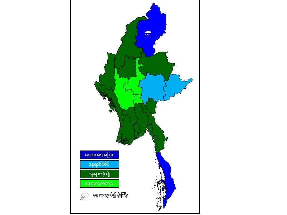 မနက်ဖြန်နံနက်အထိခန့်မှန်းချက်။ နေပြည်တော်၊ မန္တလေးတိုင်းဒေသကြီးနှင့် မကွေးတိုင်းဒေသကြီးတို့တွင် နေရာကွက်ကျား၊ စစ်ကိုင်းတိုင်းဒေသကြီး၊ ပဲခူးတိုင်းဒေသကြီး၊ ရန်ကုန်တိုင်းဒေသကြီး၊ ဧရာဝတီတိုင်းဒေသကြီး၊ ရှမ်းပြည်နယ်(မြောက်ပိုင်း)၊ ချင်းပြည်နယ်၊ ရခိုင်ပြည်နယ်၊ ကယားပြည်နယ်၊ ကရင်ပြည်နယ်နှင့် မွန်ပြည်နယ်တို့တွင် နေရာကျဲကျဲ၊ ရှမ်းပြည်နယ်(တောင်ပိုင်းနှင့် အရှေ့ပိုင်း)တွင် နေရာစိပ်စိပ်နှင့် ကျန်တိုင်းဒေသကြီးနှင့် ပြည်နယ်တို့တွင် နေရာအနှံ့အပြား မိုးထစ်ချုန်းရွာပြီး၊ ကချင်ပြည်နယ်တွင် နေရာကွက်၍ မိုးကြီး နိုင်ပါသည်။ ရွာရန်ရာနှုန်းပြည့် ဖြစ်ပါသည်။