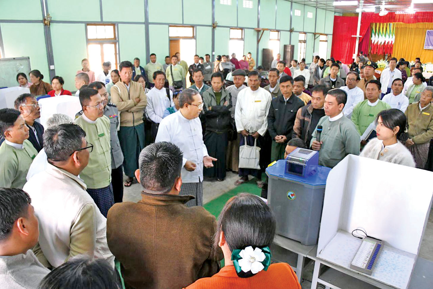 သင်တန်းဖွင့်ပွဲတွင် ပြည်ထောင်စုရွေးကောက်ပွဲ ကော်မရှင်အဖွဲ့ဝင် ရှမ်းပြည်နယ်(မြောက်ပိုင်း) တာဝန်ခံက ၂၀၂၅ ခုနှစ် ပါတီစုံဒီမိုကရေစီအထွေထွေ ရွေးကောက်ပွဲတွင် အပိုင်းလိုက်ခွဲပြီး ဆောင်ရွက် ရမည့်အခြေအနေ၊ မြန်မာအီလက်ထရောနစ် မဲပေးစက်(MEVM)များကို လက်ခံခြင်း၊ တပ်ဆင်ခြင်း၊ စမ်းသပ်ခြင်း၊ နေရာချထားခြင်းနှင့် ကိုင်တွယ် အသုံးပြုရမည့် အခြေအနေများ၊ ကြိုတင်မဲပေးခြင်းဆိုင်ရာ ကိစ္စရပ်များနှင့် ရွေးကောက်ပွဲအောင်မြင်စွာ ကျင်းပနိုင်ရေးအတွက် ဆောင်ရွက်ရမည့်လုပ်ငန်း စဉ်များကို ရှင်းလင်းမှာကြားသည်။