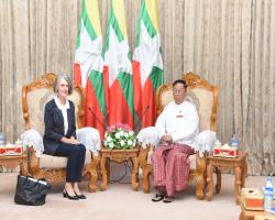 ပြည်ထောင်စုရွေးကောက်ပွဲကော်မရှင်ဥက္ကဋ္ဌ ဦးလှသိန်းသည် မြန်မာနိုင်ငံဆိုင်ရာ သြစတြေးလျ သံအမတ်ကြီး H.E. Ms. Andrea Faulkner နှင့်အဖွဲ့အား ယနေ့နံနက် ၁၀ နာရီတွင် နေပြည်တော်ရှိ ပြည်ထောင်စုရွေးကောက်ပွဲကော်မရှင် ဥက္ကဋ္ဌရုံး၊ ဧည့်တွေ့ခန်းမဆောင်၌ လက်ခံတွေ့ဆုံသည်။