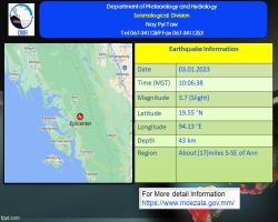 ၂၀၂၃ ခုနှစ်၊ ဇန်နဝါရီလ (၃)ရက်နေ့၊ မြန်မာစံတော်ချိန် (၁၀)နာရီ၊ (၀၆)မိနစ်၊ (၃၈)စက္ကန့် အချိန်တွင် စစ်တွေမြေငလျင်စခန်းမှ အရှေ့တောင်ဘက် မိုင် (၉၀) ခန့်ကွာဝေးသော မြန်မာနိုင်ငံပြည်တွင်း (အမ်းမြို့၏ တောင်-အရှေ့တောင်ဘက် (၁၇)မိုင်ခန့်အကွာ)၊ မြောက်လတ္တီတွဒ် (၁၉.၅၅) ဒီဂရီ၊ အရှေ့လောင်ဂျီတွဒ် (၉၄.၁၃)ဒီဂရီ၊ အနက် (၄၃)ကီလိုမီတာကို ဗဟိုပြု၍ အင်အားရစ်(ခ်)တာစကေး (၃.၇)အဆင့်ရှိ အင်အားအနည်