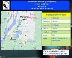 ၂၀၂၂ ခုနှစ်၊ ဒီဇင်ဘာလ (၁၆)ရက်နေ့၊ မြန်မာစံတော်ချိန် (၁၄)နာရီ၊ (၂၈)မိနစ်၊ (၃၁) စက္ကန့်အချိန်တွင် မန္တလေးမြေငလျင်စခန်းမှ အနောက်တောင်ဘက် (၁၁)မိုင် ခန့်ကွာဝေးသော မြန်မာနိုင်ငံပြည်တွင်း (အမရပူရမြို့၏ အနောက်တောင်ဘက် (၃)မိုင် ခန့်အကွာ) မြောက်လတ္တီတွဒ် (၂၁.၈၈)ဒီဂရီ၊ အရှေ့လောင်ဂျီတွဒ် (၉၆.၀၃)ဒီဂရီ၊ အနက် (၉)ကီလိုမီတာကို ဗဟိုပြု၍ အင်အားရစ်(ခ်)တာစကေး (၄.၇) အဆင့်ရှိ အင်အားအနည်းငယ်