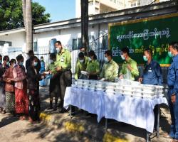 မန္တလေးတိုင်းဒေသကြီးအစိုးရအဖွဲ့၏စီစဉ်မှုဖြင့် ပြည်သူများ ဈေးနှုန်းသက်သာစွာ ဝယ်ယူစားသောက်နိုင်ရန် ထမင်းတစ်ဘူး ငါးရာကျပ်ဖြင့် ယနေ့တွင်မန္တလေးမြို့ ချမ်းအေးသာစံမြို့နယ်၊ မန္တလေးပြည်သူ့ဆေးရုံကြီးရှေ့တွင် ရောင်းချပေးသည်။