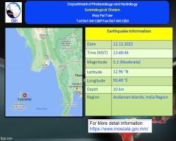 ၂၀၂၂ ခုနှစ်၊ ဒီဇင်ဘာလ (၁၂)ရက်နေ့၊ မြန်မာစံတော်ချိန် (၁၃)နာရီ၊ (၄၈)မိနစ်၊ (၄၆)စက္ကန့် အချိန်တွင် ကမ္ဘာအေးမြေငလျင်စခန်းမှ အနောက်တောင်ဘက် (၃၂၂)မိုင်ခန့်ကွာဝေးသော မြန်မာနိုင်ငံပြည်ပ (Andaman Islands, India Region)၊ မြောက်လတ္တီတွဒ် (၁၂.၉၆)ဒီဂရီ၊ အရှေ့လောင်ဂျီတွဒ် (၉၃.၄၉)ဒီဂရီ၊ အနက် (၁၀)ကီလိုမီတာခန့်ကို ဗဟိုပြု၍ အင်အား ရစ်(ခ်)တာ စကေး (၅.၁)အဆင့်ရှိ အင်အားအသင့်အတင့်ရှိသော မြေ