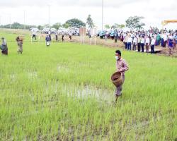 စိုက်ပျိုးရေးဦးစီးဌာနနှင့် စက်မှုလယ်ယာဦးစီးဌာနတို့ ပူးပေါင်းဆောင်ရွက်သည့် ဓာတ်မြေဩဇာနှင့် သဘာဝမြေဩဇာ(၁ : ၃) ရောစပ်ကြဲပက်ပွဲနှင့် တမန်းနိုးစက်ဖြင့် တမန်းနိုးခြင်းသရုပ်ပြပွဲ အခမ်းအနားကို