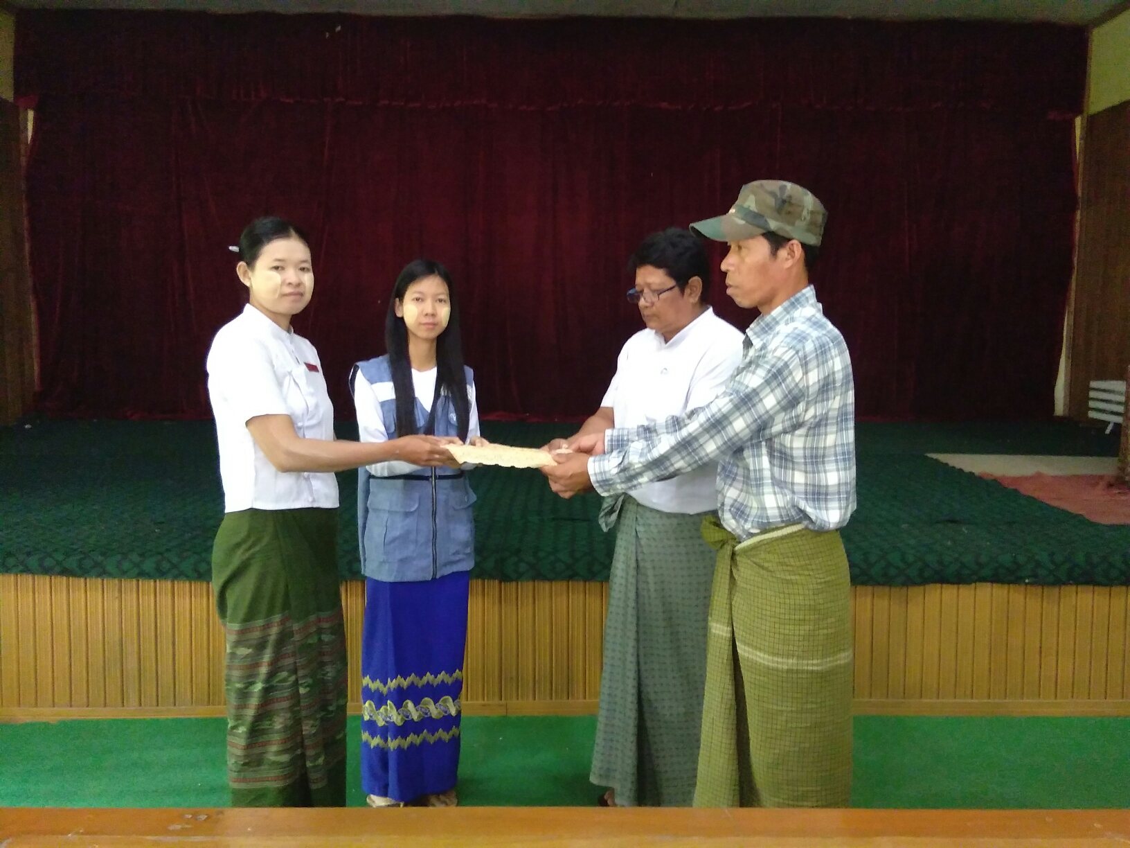 အဆိုပါပေးအပ်ပွဲတွင် မြို့နယ်အုပ်ချုပ်ရေးမှုး ဦးကျော်ဆွေနှင့် ဌာနဆိုင်ရာတာဝန်ရှိသူများက လေဘေးသင့် အိမ်ထောင်စုများနှင့် တွေ့ဆုံ၍ အားပေးစကားများပြောကြားခဲ့ကြသည်။ ယင်းနောက် လေဘေးသင့် ပြိုလဲနေအိမ် ၁ လုံးအတွက် အိမ်ဆောက်ပစ္စည်းဖိုး ထောက်ပံ့ငွေကျပ်တစ်သိန်း၊ လူဦးရေ ၆ ဦးအတွက် ဆန်ရိက္ခာဖိုး ၇ ရက်စာ ထောက်ပံ့ငွေကျပ် ၁၂၆၀ဝ၊ ကယ်ဆယ်ရေးပစ္စည်း ၁၆ မျိုးပါ ပလပ်စတစ်ပုံး ၁ ပုံး၊ အမိုးလန်နေအိမ် ၃၃ လုံးအတွက် အိမ်ဆောက်ပစ္စည်းဖိုး ထောက်ပံ့ငွေ ကျပ် ၈၉၆၃၅၀၊ စုစုပေါင်း ထောက်ပံ့ငွေ (၁၀ဝ၈၉၅ဝိ/) ကျပ် ပေးအပ်ခဲ့ကြောင်း သိရသည်။