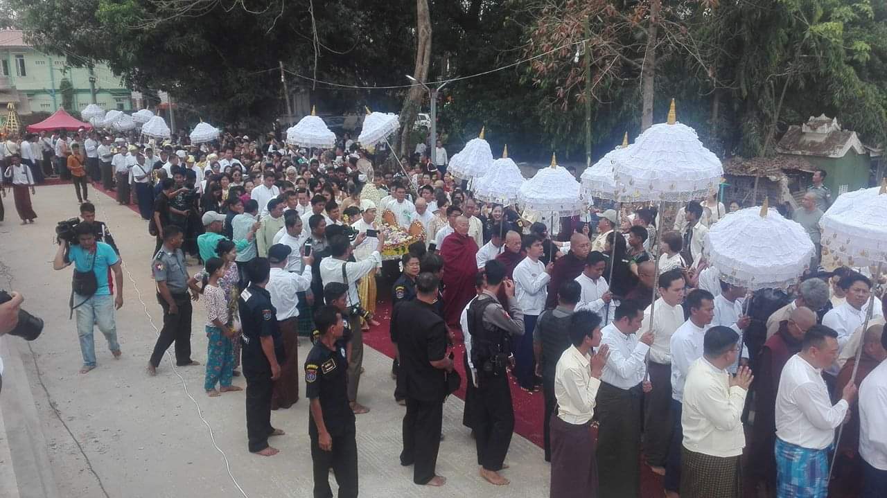 ရန်ကုန်တိုင်းဒေသကြီး မှော်ဘီမြို့နယ် နှောကုန်းကျေးရွာ သဲအင်းဂူဗဟိုဌာနချုပ်ရိပ်သာကြီး ဝတ္ထုကံတော်အတွင်း လေးကျွန်းဓမ္မစကြာရှင် စေတီတော်မြတ်ကြီး၌ အထက်ဌာပနာသွင်း ရွှေထီးတော်တင်လှူပွဲနှင့် ဗုဒ္ဓဘိသေက အနေကဇာတင် မင်္ဂလာအခမ်းအနားကို ဧပြီ ၁၉ ရက် ယနေ့နံနက် ၇ နာရီအချိန်က ကျင်းပပြုလုပ်ခဲ့သည်။