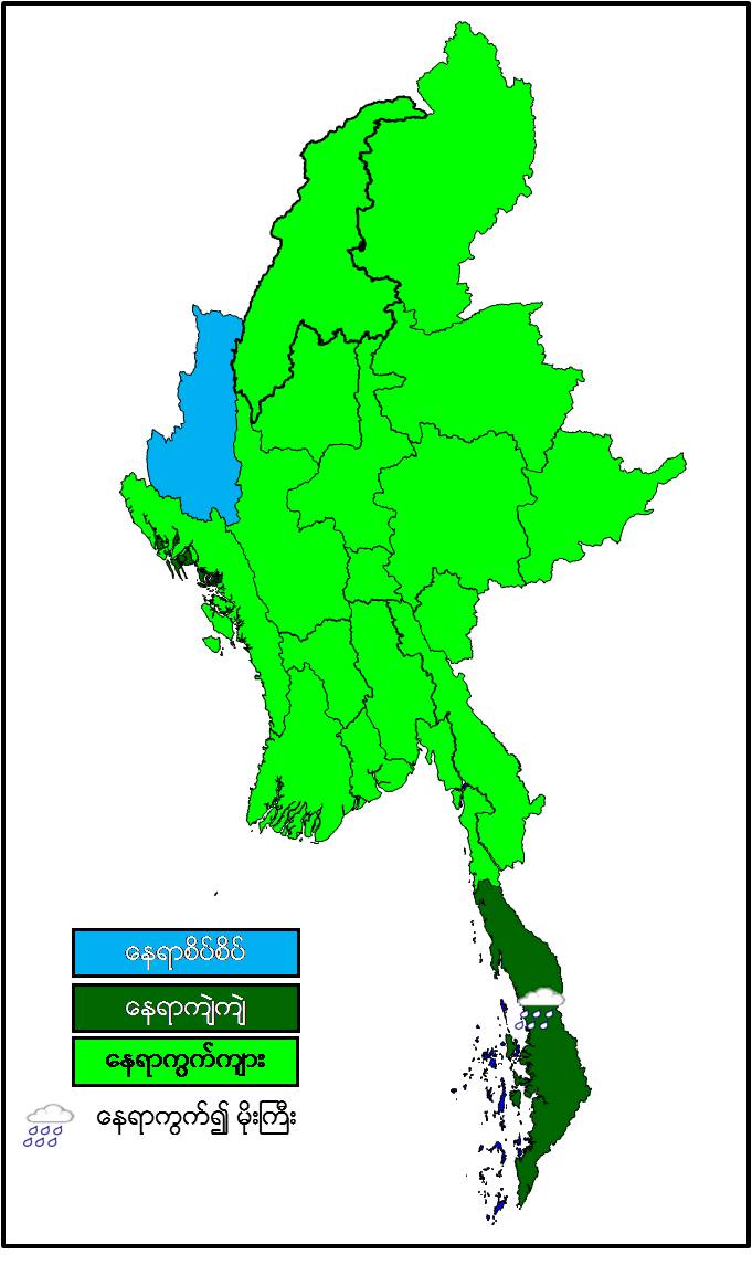 မနက်ဖြန်နံနက်အထိ ခန့်မှန်းချက်အနေဖြင့် ချင်းပြည်နယ်တွင် နေရာစိပ်စိပ်၊ တနင်္သာရီတိုင်းဒေသကြီးတွင် နေရာကျဲကျဲနှင့် ကျန်တိုင်းဒေသကြီးနှင့် ပြည်နယ်တို့တွင် နေရာကွက်ကျား မိုးထစ်ချုန်းရွာပြီး၊ တနင်္သာရီတိုင်းဒေသကြီးတွင် နေရာကွက်၍ မိုးကြီးနိုင်သည်။ ရွာရန်ရာနှုန်း(၈၀) ဖြစ်သည်။