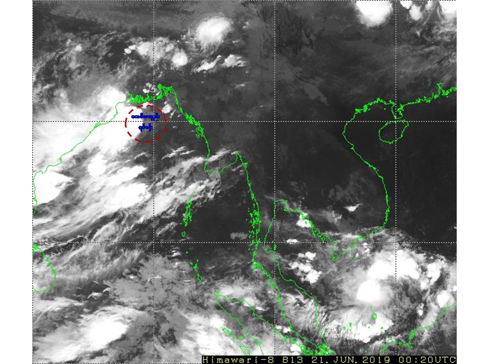 ၂၀၁၉ ခုနှစ်၊ ဇွန်လ (၂၁) ရက်နေ့ မြန်မာစံတော်ချိန် ၆ နာရီခွဲအချိန် တိုင်းထွာချက်များအရ ဘင်္ဂလားပင်လယ်အော်အရှေ့မြောက်ပိုင်းတွင် ဖြစ်ပေါ်နေသော လေဖိအားနည်းရပ်ဝန်းသည် ဆက်လက်တည်ရှိနေကြောင်း မိုးလေဝသနှင့် ဇလဗေဒညွှန်ကြားမှု ဦးစီးဌာနမှ ထုတ်ပြန်ထားသည်။