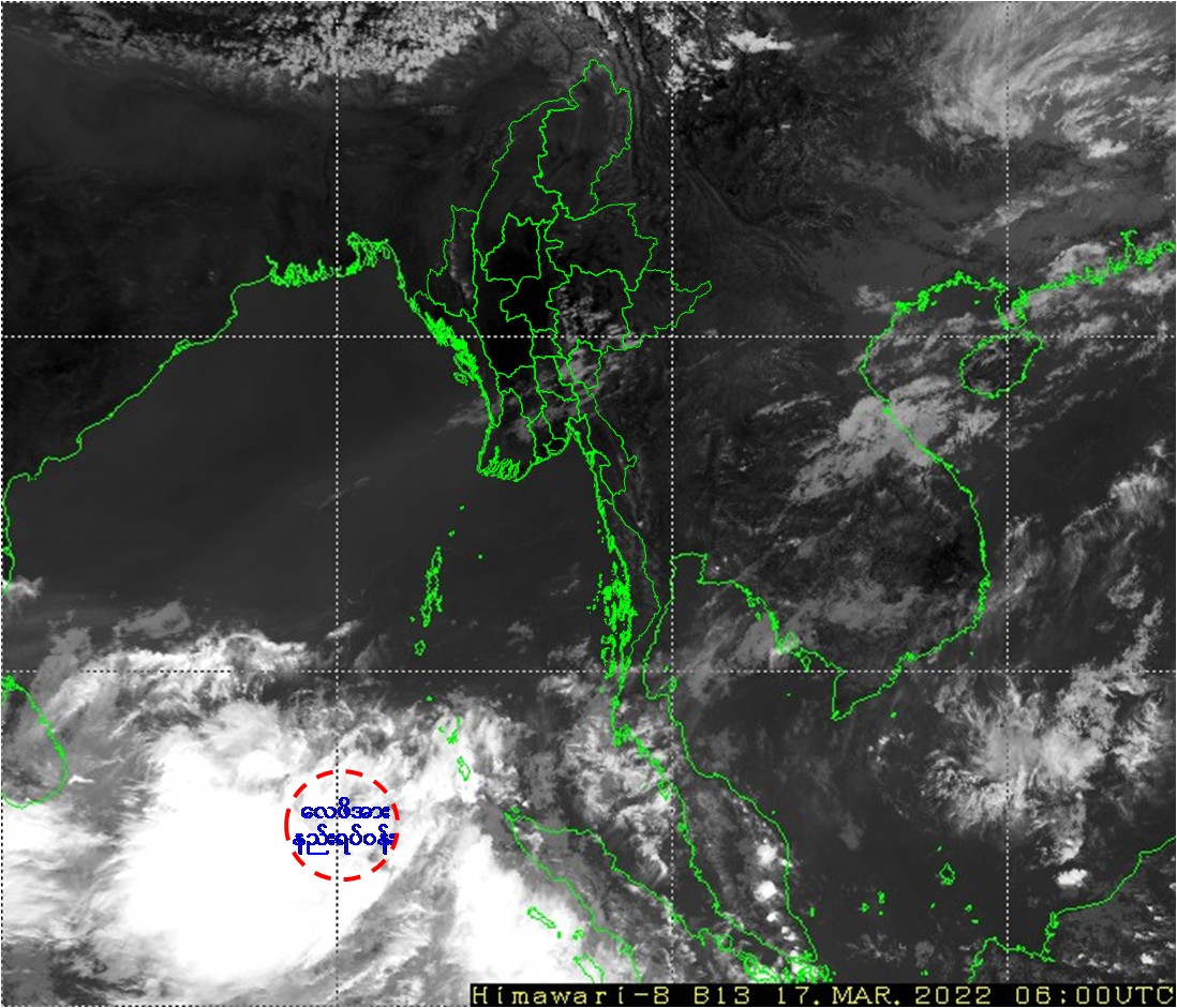 ယနေ့မြန်မာစံတော်ချိန် မွန်းလွဲ ၁၂ နာရီခွဲ တိုင်းထွာချက်များအရ ဘင်္ဂလားပင်လယ်အော် အရှေ့တောင်ပိုင်းနှင့် အီကွေတာအနီး အိန္ဒိယသမုဒ္ဒရာအရှေ့ပိုင်းတို့တွင် ဖြစ်ပေါ်နေသော လေဖိအားနည်းရပ်ဝန်းသည် ဆက်လက်တည်ရှိနေသည်။ အဆိုပါ လေဖိအားနည်းရပ်ဝန်းသည် ပိုမိုအားကောင်းလာပြီး ကနဦးတွင် အရှေ့-အရှေ့မြောက်ဘက်သို့ ရွေ့လျားကာ ဘင်္ဂလားပင်လယ်အော် အရှေ့တောင်ပိုင်းနှင့် ယင်းနှင့်ဆက်စပ်လျက်ရှိသော ကပ္ပလီပင်လယ်ပြင်တောင်ပိုင်းသို့ ရောက်ရှိပြီး မြောက်-အနောက်မြောက်ဘက်သို့ ဆက်လက်ရွေ့လျားကာ ကပ္ပလီပင်လယ်ပြင်၊ နီကိုးဘားကျွန်းနှင့် ကိုကိုးကျွန်းတို့အနီးတွင်(၂၀.၃.၂၀၂၂)ရက်နေ့၌ မုန်တိုင်းငယ် (Depression) အဖြစ်သို့လည်းကောင်း၊ (၂၁.၃.၂၀၂၂)ရက်နေ့၌ ဆိုင်ကလုန်းမုန်တိုင်း (Cyclonic Storm) အဖြစ်သို့လည်းကောင်း အားကောင်းလာနိုင်ပြီး မြောက်ဘက်သို့ ဆက်လက်ရွေ့လျားကာ (၂၂.၃.၂၀၂၂)ရက်နေ့တွင် ဘင်္ဂလားဒေ့ရှ်နိုင်ငံ (Bangladesh)နှင့် မြန်မာနိုင်ငံ ရခိုင်ကမ်းရိုးတန်းအနီးသို့ ရောက်ရှိနိုင်သည်ဟု ခန့်မှန်းရသည်။