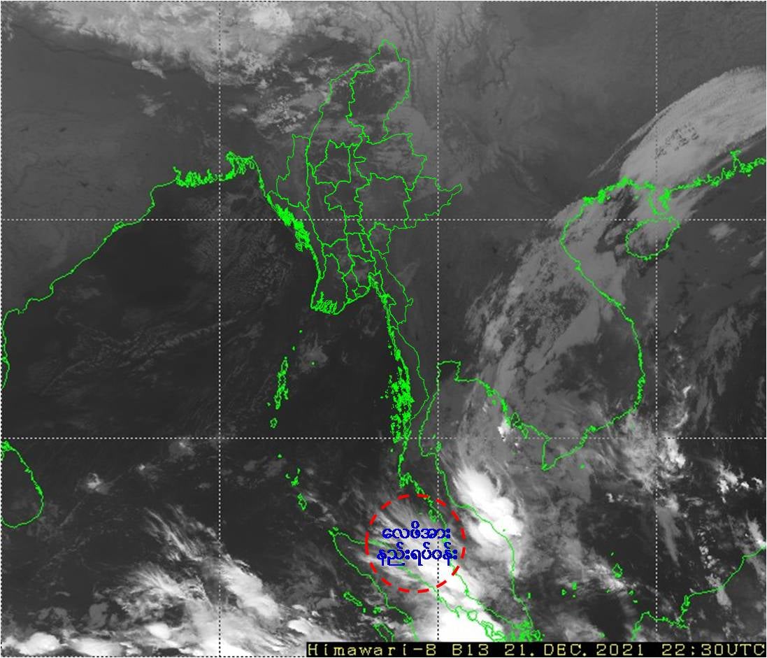 "ယနေ့မြန်မာစံတော်ချိန် (၀၅:၃၀)နာရီအချိန် တိုင်းထွာချက်များအရ ကပ္ပလီပင်လယ်ပြင် တောင်ပိုင်းနှင့် ယင်းနှင့်ဆက်စပ်လျက်ရှိသော မလက္ကာရေလက်ကြားတွင် ဖြစ်ပေါ်နေသော လေဖိအားနည်းရပ်ဝန်း သည် မလက္ကာရေလက်ကြားမြောက်ပိုင်းသို့ ရောက်ရှိခဲ့ပြီး တဖြည်းဖြည်းအားလျော့သွားမည်ဟု ခန့်မှန်းရပါသည်။"