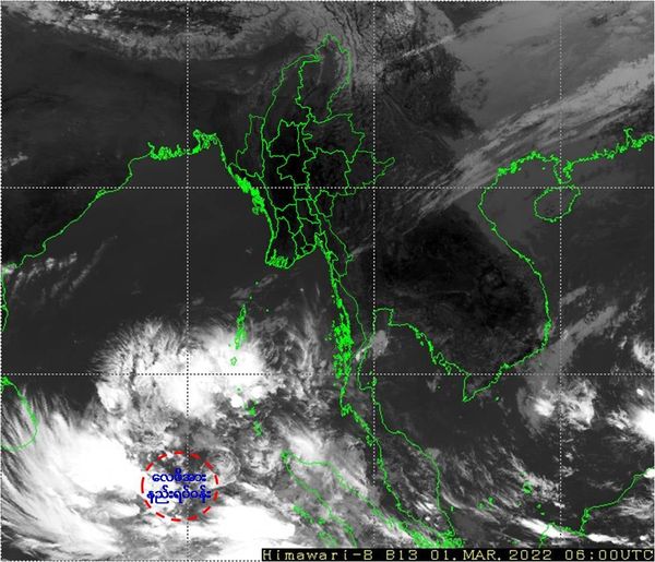 “ယနေ့မြန်မာစံတော်ချိန် မွန်းလွဲ ၁၂ နာရီခွဲ တိုင်းထွာချက်များအရ ဘင်္ဂလားပင်လယ်အော် အရှေ့တောင်ပိုင်းနှင့် ယင်းနှင့်ဆက်စပ်လျက်ရှိသော ကပ္ပလီပင်လယ်ပြင်တောင်ပိုင်းနှင့် အီကွေတာအနီး အိန္ဒိယသမုဒ္ဒရာတို့တွင် ဖြစ်ပေါ်နေသော လေဖိအားနည်းရပ်ဝန်းသည် ဘင်္ဂလားပင်လယ်အော် အရှေ့တောင်ပိုင်းနှင့် ယင်းနှင့်ဆက်စပ်လျက်ရှိသော အီကွေတာအနီး အိန္ဒိယသမုဒ္ဒရာတို့တွင် ဆက်လက်တည်ရှိနေပါသည်။ အဆိုပါ လေဖိအားနည်းရပ်ဝန်းသည် အနောက်-အနောက် မြောက်ဘက်သို့ ဆက်လက်ရွေ့လျားမည်ဟု ခန့်မှန်းရပါသည်။”
