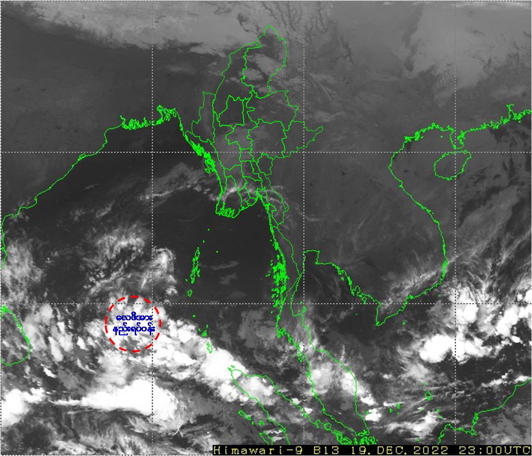 “ယနေ့မြန်မာစံတော်ချိန် (၀၅:၃၀) နာရီအချိန် တိုင်းထွာချက်များအရ ဘင်္ဂလားပင်လယ်အော် တောင်ပိုင်းနှင့် ယင်းနှင့်ဆက်စပ်လျက်ရှိသော အီကွေတာအနီး အိန္ဒိယသမုဒ္ဒရာအရှေ့ပိုင်း တို့တွင် ဖြစ်ပေါ်နေသော လေဖိအားနည်းရပ်ဝန်း(Low Pressure Area)သည် ဆက်လက် တည်ရှိနေပါသည်။”