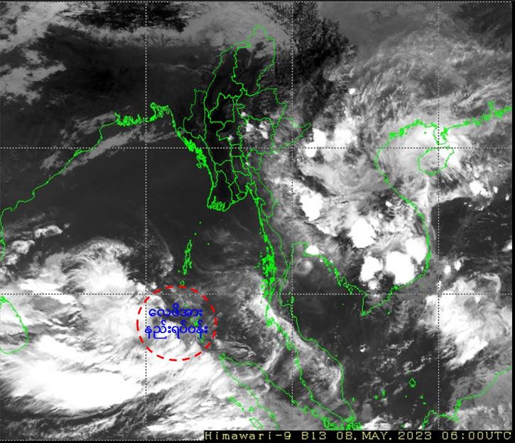 ယနေ့မြန်မာစံတော်ချိန် (၁၂:၃၀)နာရီအချိန် တိုင်းထွာချက်များအရ ဘင်္ဂလားပင် လယ်အော် အရှေ့တောင်ပိုင်းနှင့် ယင်းနှင့်ဆက်စပ်လျက်ရှိသော ကပ္ပလီပင်လယ်ပြင် တောင်ပိုင်းတို့တွင် လေဖိအားနည်းရပ်ဝန်းတစ်ခု ဖြစ်ပေါ်နေပါသည်။ အဆိုပါ လေဖိအားနည်းရပ်ဝန်း(Low Pressure Area)သည် ပိုမိုအားကောင်းလာနိုင်ပြီး၊ (၉.၅.၂၀၂၃)ရက်နေ့တွင် မုန်တိုင်းငယ်(Depression)အဖြစ်သို့ ရောက်ရှိနိုင်ကာ၊ မြောက်ဘက်သို့ ဆက်လက်ရွေ့လျားနိုင်ပြီး (၁၀.၅.၂၀၂၃)ရက်နေ့တွင် ဘင်္ဂလား ပင်လယ်အော်အလယ်ပိုင်းနှင့် ယင်းနှင့်ဆက်စပ်လျက်ရှိသော ကပ္ပလီပင်လယ်ပြင် မြောက်ပိုင်းတို့တွင် ဆိုင်ကလုန်းမုန်တိုင်း (Cyclonic Storm)အဖြစ်သို့ အားကောင်း လာနိုင်သည်ဟု ခန့်မှန်းရပါသည်။