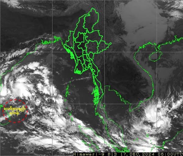 “ယနေ့မြန်မာစံတော်ချိန် (၁၂:၃၀)နာရီအချိန် တိုင်းထွာချက်များအရ ဘင်္ဂလားပင်လယ်အော် အနောက်တောင်ပိုင်းတွင် ဖြစ်ပေါ်နေသော လေဖိအားနည်းရပ်ဝန်း(Low Pressure Area) သည် ဆက်လက်တည်ရှိနေပါသည်။ အဆိုပါ လေဖိအားနည်းရပ်ဝန်းသည် ပိုမိုအားကောင်းလာနိုင်ပြီး၊ အနောက်-အနောက်မြောက်ဘက်သို့ ရွေ့လျားနိုင်ကာ နောက် ၂ ရက်အတွင်း အိန္ဒိယနိုင်ငံ၊ တမီးလ်နာဒူးကမ်းခြေသို့ ရောက်ရှိနိုင်သည်ဟု ခန့်မှန်းရပါသည်၊၊”