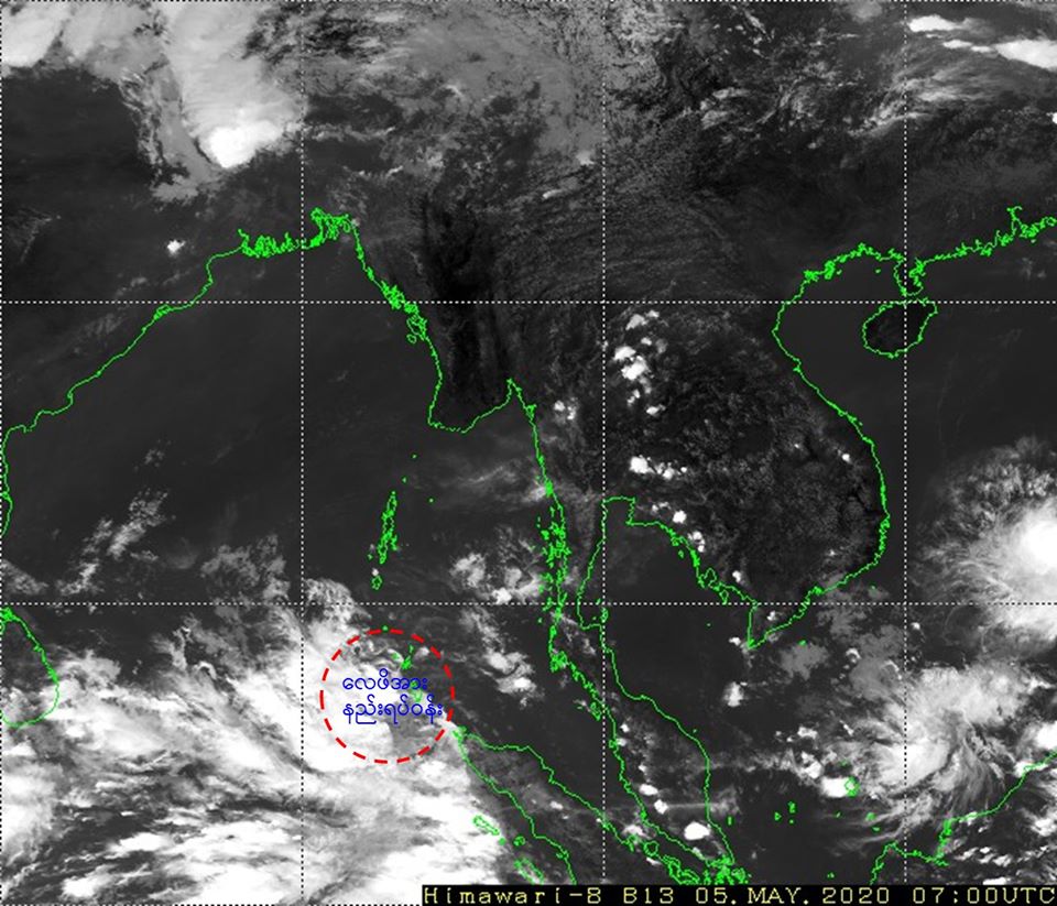"ယနေ့ မြန်မာစံတော်ချိန် (၁၃:၃၀)နာရီအချိန် တိုင်းထွာချက်များအရ ကပ္ပလီပင်လယ်ပြင် တောင်ပိုင်းနှင့် ယင်းနှင့်ဆက်စပ်လျက်ရှိသော ဘင်္ဂလားပင်လယ်အော် အရှေ့တောင်ပိုင်းတို့တွင် ဖြစ်ပေါ် နေသော လေဖိအားနည်းရပ်ဝန်းသည် ဆက်လက်တည်ရှိနေပါသည်။ အဆိုပါလေဖိအားနည်း ရပ်ဝန်းသည် နောက်(၃)ရက်အတွင်း သိသိသာသာ အားကောင်းလာနိုင်သည့် အခြေအနေမရှိကြောင်း ခန့်မှန်းရပါသည်။"