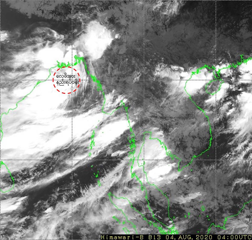 "ယနေ့မြန်မာစံတော်ချိန် (၁၀:၃၀)နာရီအချိန် တိုင်းထွာချက်များအရ ဘင်္ဂလား ပင်လယ်အော်မြောက်ပိုင်းတွင် လေဖိအားနည်းရပ်ဝန်းတစ်ခု ဖြစ်ပေါ်နေပါသည်။"