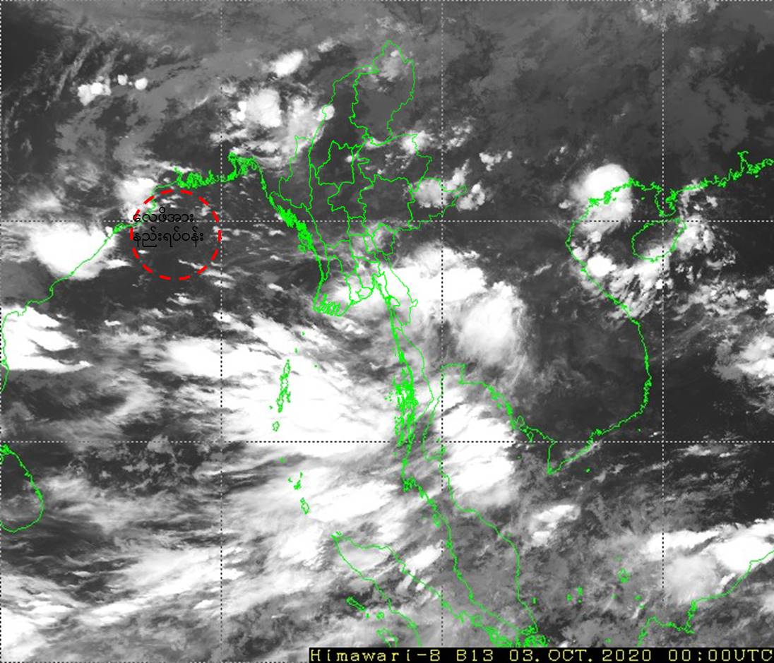 "ယနေ့မြန်မာစံတော်ချိန် (၀၆:၃၀)နာရီအချိန် တိုင်းထွာချက်များအရ ဘင်္ဂလား ပင်လယ်အော်အနောက်မြောက်ပိုင်းနှင့် ယင်းနှင့်ဆက်စပ်လျက်ရှိသော ဘင်္ဂလားပင်လယ် အော်အနောက်အလယ်ပိုင်း(အိန္ဒိယနိုင်ငံ၊ ဩရိဿပြည်နယ်ကမ်းလွန်-အင်ဒရာပရာဒေ့ရှ် ပြည်နယ် မြောက်ပိုင်းကမ်းခြေ)တို့တွင် ဖြစ်ပေါ်နေသော လေဖိအားနည်းရပ်ဝန်းသည် ဆက်လက်တည်ရှိနေပါသည်။"