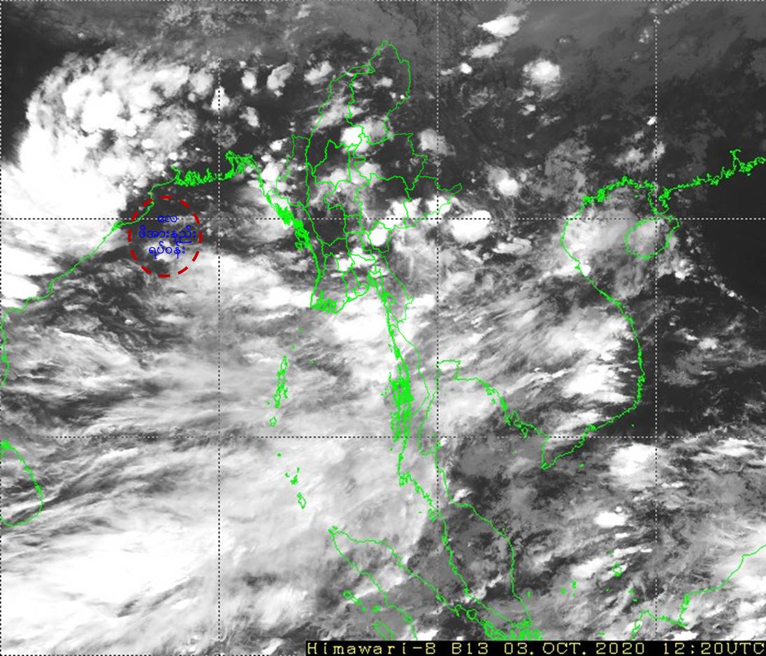 "ယနေ့မြန်မာစံတော်ချိန် (၁၈:၃၀)နာရီအချိန် တိုင်းထွာချက်များအရ ဘင်္ဂလားပင်လယ်အော်အနောက်မြောက်ပိုင်းနှင့် ယင်းနှင့်ဆက်စပ်လျက်ရှိသော အိန္ဒိယနိုင်ငံ၊ ဩရိဿပြည်နယ်ကမ်းခြေတို့တွင် ဖြစ်ပေါ်နေသော လေဖိအားနည်းရပ်ဝန်းသည် ဆက်လက်တည်ရှိ နေပါသည်။"