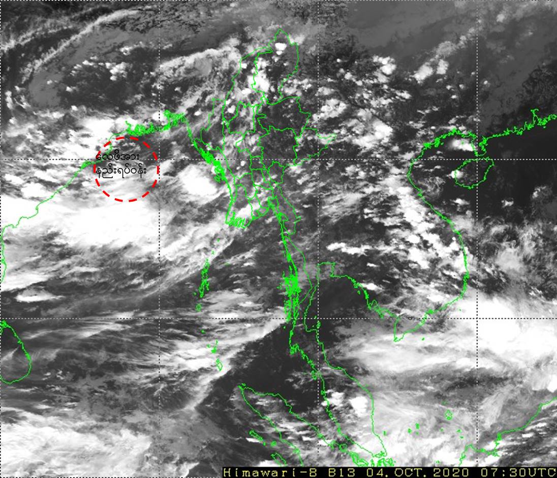 "ယနေ့မြန်မာစံတော်ချိန် (၁၃:၃၀)နာရီအချိန် တိုင်းထွာချက်များအရ ဘင်္ဂလား ပင်လယ်အော်အနောက်မြောက်ပိုင်းနှင့် ယင်းနှင့်ဆက်စပ်လျက်ရှိသော အိန္ဒိယနိုင်ငံ၊ ဩရိဿ ပြည်နယ်ကမ်းခြေတို့တွင် ဖြစ်ပေါ်နေသော လေဖိအားနည်းရပ်ဝန်းသည် ဆက်လက်တည်ရှိ နေပါသည်။"