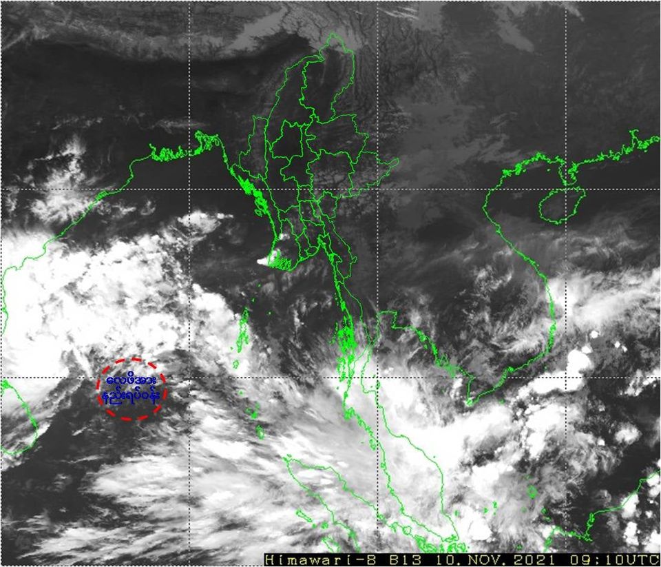 ဘင်္ဂလားပင်လယ်အော်အခြေအနေ။ ယနေ့မြန်မာစံတော်ချိန် (၁၃:၃၀)နာရီအချိန် တိုင်းထွာချက်များအရ ဘင်္ဂလားပင်လယ်အော်အရှေ့တောင်ပိုင်းနှင့် ယင်းနှင့် ဆက်စပ်လျက်ရှိသော ဘင်္ဂလားပင်လယ်အော် အနောက်တောင်ပိုင်းတို့တွင် ဖြစ်ပေါ်နေသော လေဖိအားနည်းရပ်ဝန်း(Low Pressure Area)သည် ဆက်လက်တည်ရှိနေပါသည်။ အဆိုပါ လေဖိအားနည်းရပ်ဝန်းသည် နောက်(၁၂)နာရီအတွင်း ဘင်္ဂလား ပင်လယ်အော်အနောက်တောင်ပိုင်းတွင် မုန်တိုင်းငယ် (Depression)အဖြစ် ပိုမိုအားကောင်းလာနိုင်ပြီး အနောက်-အနောက်မြောက်ဘက်သို့ ဆက်လက်ရွေ့လျားကာ (၁၁.၁၁.၂၀၂၁)ရက်နေ့၌ အိန္ဒိယနိုင်ငံ၊ တမီးလ်နာဒူးမြောက်ပိုင်းကမ်းခြေနှင့် ယင်းနှင့်ဆက်စပ်လျက်ရှိသော အင်ဒရာပရာဒေ့ရှ်တောင်ပိုင်း ကမ်းခြေကို ဖြတ်ကျော်နိုင်သည်ဟု ခန့်မှန်းရသည်။