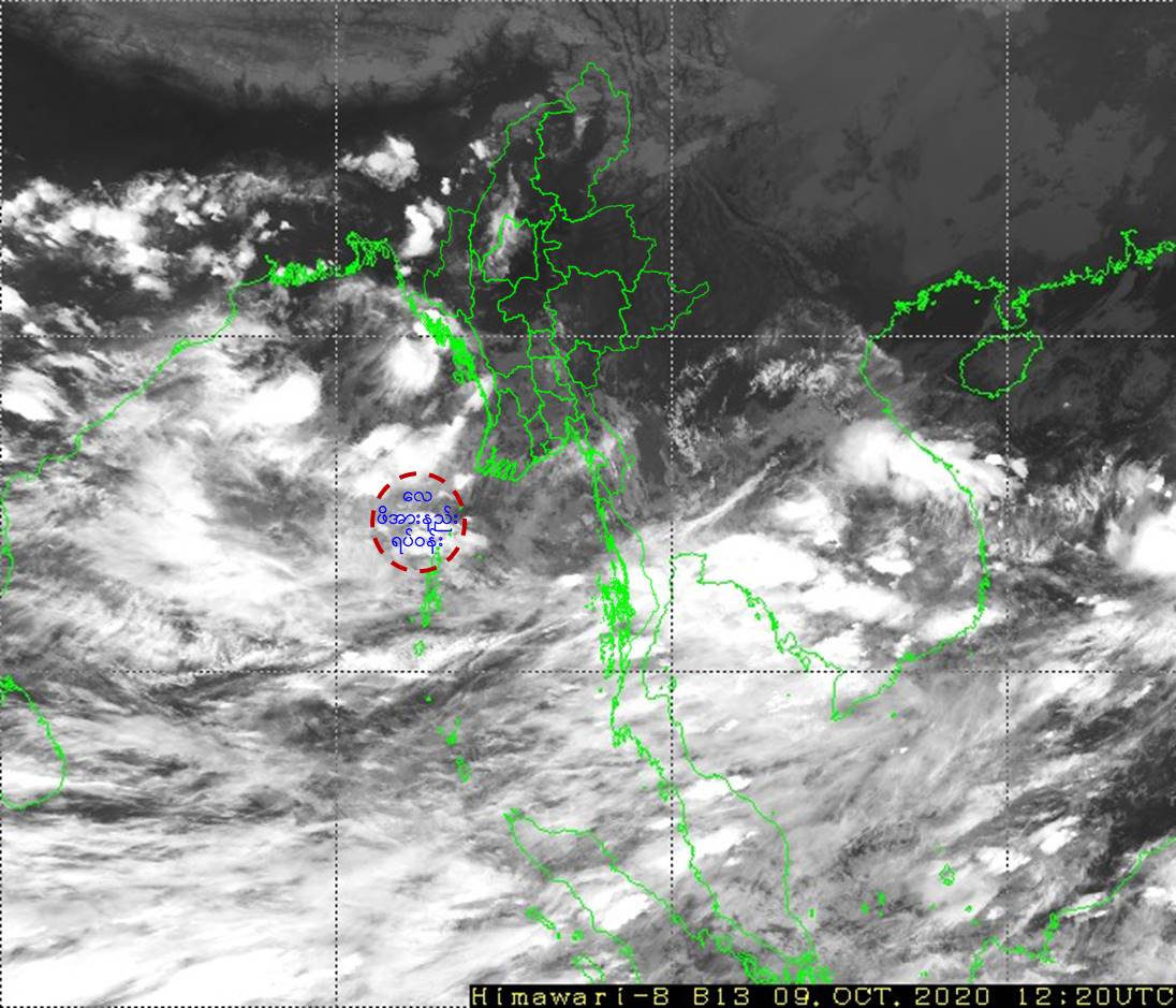 ၂။ အဆိုပါ လေဖိအားနည်းရပ်ဝန်း၏အရှိန်ကြောင့် ယနေ့ညမှ (၁၃.၁၀.၂၀၂၀) ရက်နေ့အတွင်း ပဲခူးတိုင်းဒေသကြီး၊ ရန်ကုန်တိုင်းဒေသကြီး၊ ဧရာဝတီတိုင်းဒေသကြီး၊ တနင်္သာရီတိုင်းဒေသကြီး၊ ကရင်ပြည်နယ်နှင့် မွန်ပြည်နယ်တို့တွင် နေရာစိပ်စိပ်မှ နေရာအနှံ့အပြား မိုးထစ်ချုန်းရွာပြီး၊ ဒေသအလိုက်မိုးကြီးခြင်းနှင့် နေရာကွက်၍ မိုးကြီးခြင်းများ ဖြစ်ပေါ်နိုင်ကာ၊ မြန်မာ့ကမ်းရိုးတန်းတစ်လျှောက်နှင့် ကမ်းလွန်ပင်လယ်ပြင်တို့တွင် ရံဖန်ရံခါ မိုးသက်လေပြင်းများ ကျရောက်ပြီး၊ လှိုင်းကြီးနိုင်ပါသည်။ မိုးသက်လေပြင်းကျစဉ် ရေပြင်/မြေပြင်လေသည် တစ်နာရီလျှင် (၃၅)မိုင်မှ မိုင်(၄၀)အထိ တိုက်ခတ်နိုင်ပါသည်။ လှိုင်းအမြင့်မှာ မြန်မာ့ကမ်းရိုးတန်းတစ်လျှောက်နှင့် ကမ်းလွန်ပင်လယ်ပြင်တို့တွင် (၈)ပေမှ (၁၁)ပေခန့် ရှိနိုင်ပါသည်။