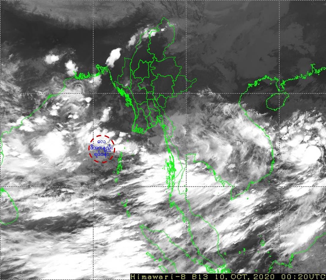 ၁။  ယနေ့မြန်မာစံတော်ချိန် (၀၆:၃၀)နာရီအချိန် တိုင်းထွာချက်များအရ  ဘင်္ဂလားပင်လယ်အော် အရှေ့အလယ်ပိုင်းနှင့် ယင်းနှင့် ဆက်စပ်လျက်ရှိသော ကပ္ပလီပင်လယ်ပြင်မြောက်ပိုင်းတို့တွင် ဖြစ်ပေါ်နေသော လေဖိအားနည်းရပ်ဝန်းသည် ဆက်လက်တည်ရှိနေပါသည်။ အဆိုပါ လေဖိအား နည်းရပ်ဝန်းသည် နောက်(၁၂)နာရီအတွင်း ဘင်္ဂလားပင်လယ်အော်အလယ်ပိုင်းတွင် မုန်တိုင်းငယ် (Depression)အဖြစ်သို့ ပိုမိုအားကောင်းလာနိုင်သည်ဟု ခန့်မှန်းရပါသည်။