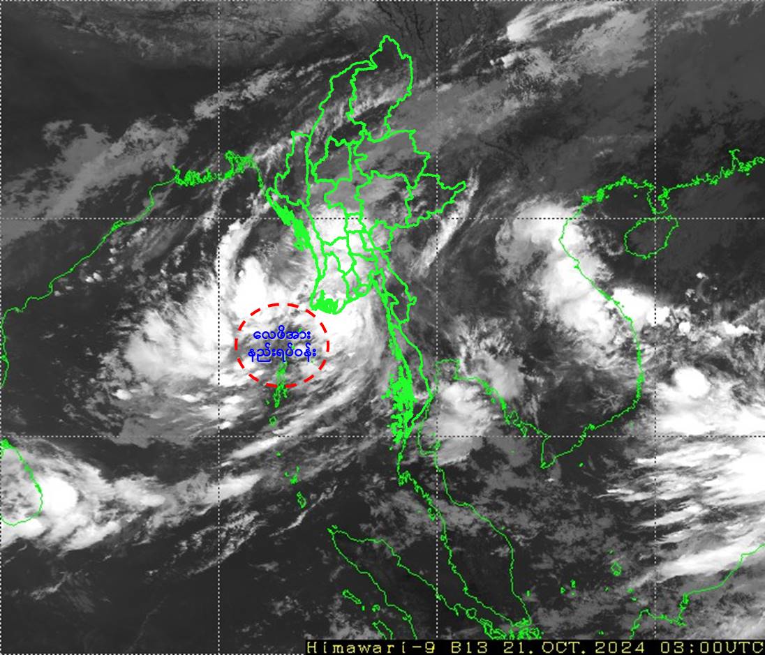 ၁။ ယနေ့မြန်မာစံတော်ချိန် (၀၉:၃၀)နာရီအချိန် တိုင်းထွာချက်များအရ ဘင်္ဂလားပင်လယ်အော် အရှေ့အလယ်ပိုင်းနှင့် ယင်းနှင့်ဆက်စပ်လျက်ရှိသော ကပ္ပလီပင်လယ်ပြင်မြောက်ပိုင်းတို့တွင် ဖြစ်ပေါ် နေသော လေဖိအားနည်းဆဲလ်သည် ပိုမိုအားကောင်းလာပြီး၊ လေဖိအားနည်းရပ်ဝန်း(Low Pressure Area)အဖြစ်သို့ ရောက်ရှိခဲ့ပါသည်။ အဆိုပါ လေဖိအားနည်းရပ်ဝန်း(Low Pressure Area)သည် အနောက်-အနောက်မြောက်ဘက်သို့ ရွေ့လျားနိုင်ပြီး၊ ပိုမိုအားကောင်းလာနိုင်ကာ ၂၂-၁၀-၂၀၂၄ ရက်နေ့တွင် မုန်တိုင်းငယ်(Depression) အဖြစ်သို့လည်းကောင်း၊ ၂၃-၁၀-၂၀၂၄ ရက်နေ့တွင် ဘင်္ဂလား ပင်လယ်အော်အရှေ့အလယ်ပိုင်း၌ ဆိုင်ကလုန်းမုန်တိုင်း(Cyclonic Storm)အဖြစ်သို့လည်းကောင်း ရောက်ရှိ နိုင်သည်ဟု ခန့်မှန်းရပါသည်။