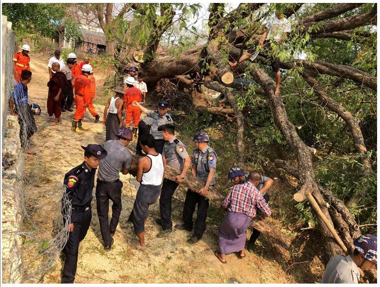 စစ်ကိုင်းတိုင်းဒေသကြီး၊ အရာတော်မြို့နယ်၊ ဝါးတန်းကျေးရွာ၊ မုံရွာ-ရွှေဘိုသွားကားလမ်း မိုင်တိုင် အမှတ် (၁၅)နှင့်(၁၆)ကြားတွင် ဧပြီ ၁၈ ရက် ညနေပိုင်းက လေပြင်းတိုက်ခတ်မှုကြောင့် လျှပ်စစ်မီးတိုင်များ၊ သစ်ပင်များ ပြိုလဲခဲ့ပြီး လမ်းပိတ်ဆို့မှု ဖြစ်ပွားခဲ့သဖြင့် အဆိုပါနေရာသို့ မြို့နယ်ရဲတပ်ဖွဲ့မှူး ရဲမှူးရဲလွင် ဦးစီးသည့် တပ်ဖွဲ့ဝင်များ၊ နယ်မြေခံတပ်မှ တပ်မတော်သားများ၊ မြို့နယ်အုပ်ချုပ်ရေးမှူးရုံးမှ ဝန်ထမ်းများ၊ မြို့နယ်မီး သတ်တပ်ဖွဲ့ဝင်များက ကျေးရွာနေ ပြည်သူများနှင့် ပူးပေါင်း၍ လမ်းပေါ်တွင် ပိတ်ဆို့နေသည့် လမ်းမီးတိုင်များနှင့် သစ်ပင်များအား ခုတ်ထွင် ရှင်းလင်းဖယ်ရှား ပေးခဲ့ကြောင်း ရဲပြန်ကြားမှ သိရသည်။